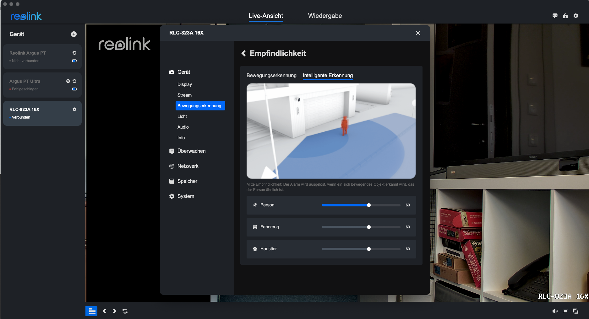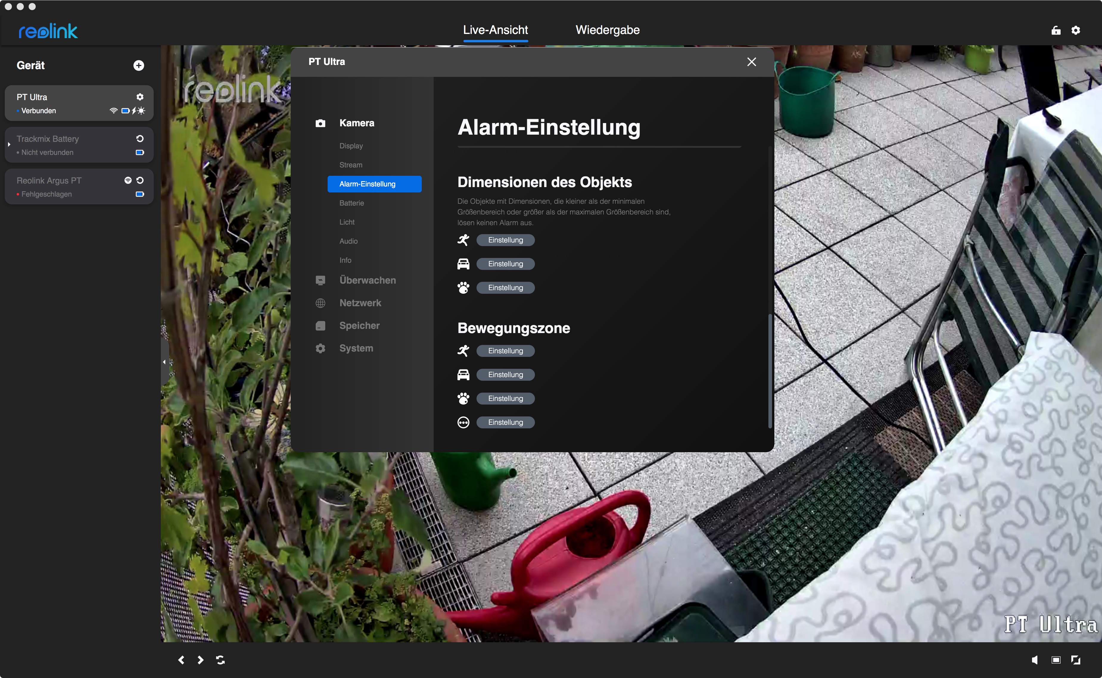 Hilfreich ist auch, wenn man den Überwachungsbereich sowie die Aufnahme auf bestimmte Objekte begrenzt. Hierfür stehen in der Reolink-App sowohl in der mobilen als auch in der Desktop-Variante entsprechende Optionen im Abschnitt Alarm-Einstellung und Überwachen – Aufnahme bereit. Dort können Anwender etwa Bewegungszonen definieren, in denen kein Alarm ausgelöst wird.