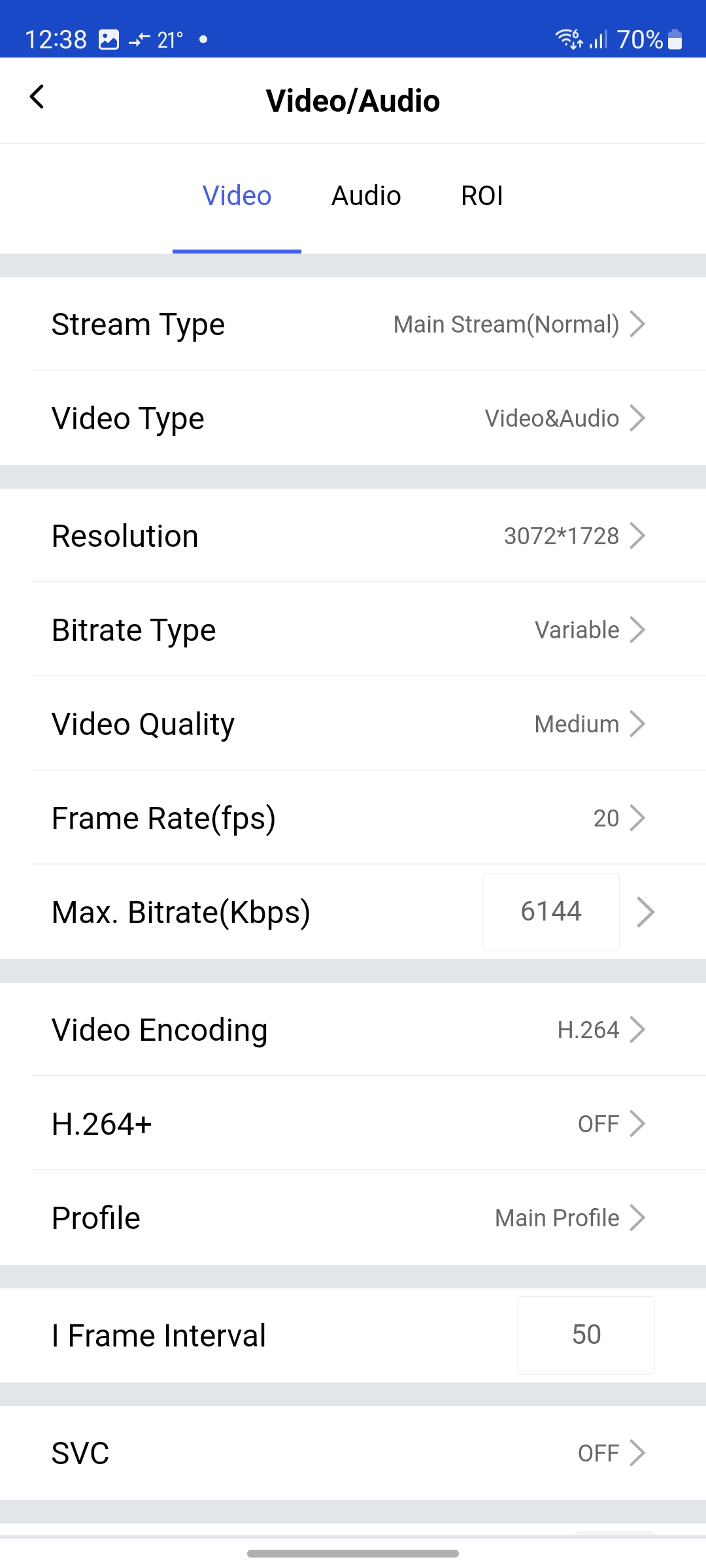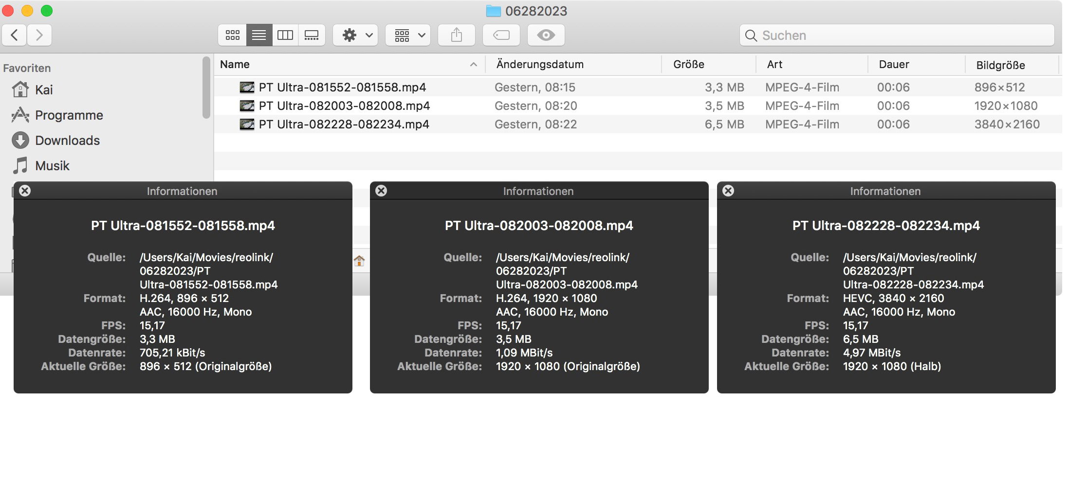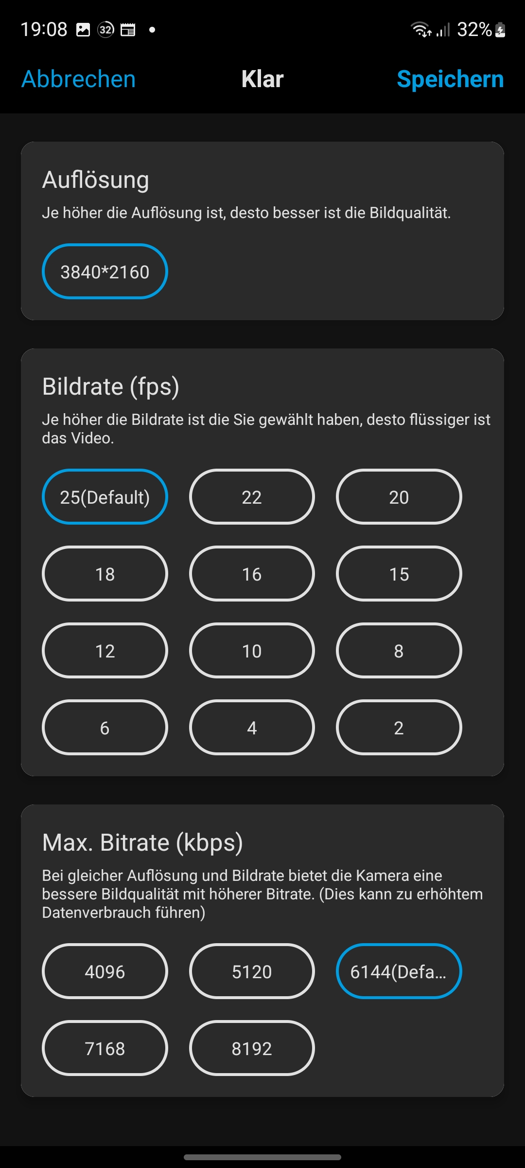 Der in der Kamera integrierte CMOS-Sensor nimmt Videos mit einer Auflösung von bis zu 3840 × 2160 Pixeln bei maximal 25 Bildern pro Sekunde und einer voreingestellten Datenrate von 6144 kbps auf. Alternativ können Anwender die Datenrate in 1024er-Schritten von 4096 bis 8192 kbps einstellen. Allerdings lässt sie sich nicht anpassen, wenn gleichzeitig eine Zeitrafferaufnahme aktiv ist (dazu später mehr). Bei voller Auflösung, die in der App mit „Klar“ oder mit „High“ bezeichnet wird, erfolgt die Aufnahme von Videos im HEVC-Codec (H.265) und mit der Option „Flüssig“ und einer Auflösung von 896 × 512 bei 20 fps sowie einer Datenrate von 1024 kbps mit H.264.