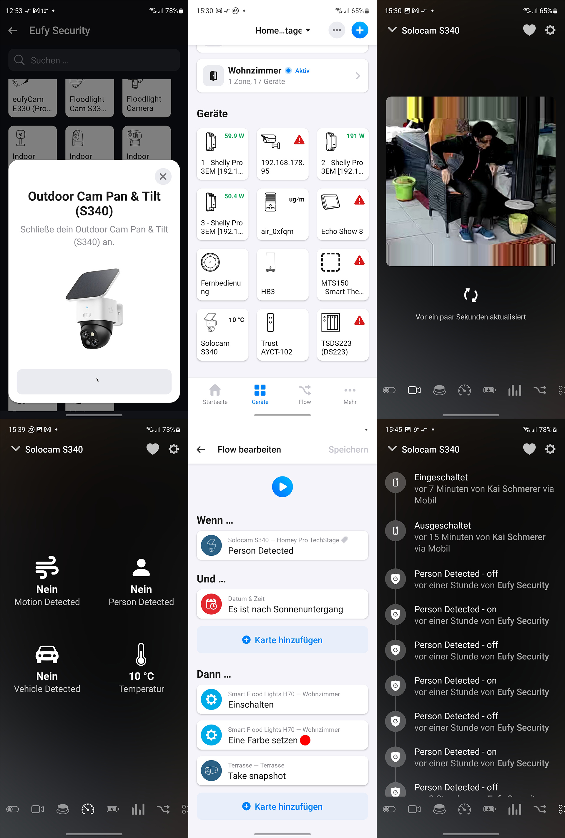 Weniger gut haben uns die Integrationsmöglichkeiten in gängige Smart-Home- und NAS-Lösungen gefallen. Zwar unterstützt die Kamera die digitalen Sprachassistenten von Google und Amazon, doch außer mit Homey Pro (Testbericht) und Home Assistant (Testbericht) lässt sich die Kamera mit anderen Smart-Home-Lösungen wie Samsung Smartthings (Testbericht) und Apple Homekit (Testbericht) nicht kombinieren. Wer aber bereits andere Überwachungskameras des Herstellers verwendet, kann alternativ zur NAS-Ersatzlösung Homebase S380 greifen. Dann gibt es nicht nur genügend Speicherplatz, sondern auch noch Zusatzfunktionen wie Gesichts- und Haustiererkennung. Und mit der inzwischen verfügbaren Cross-Kamera-Verfolgung, die aus mehreren Videos verschiedener Eufy-Kameras eine Aufnahme erstellt, bietet Eufy ein bislang einzigartiges Sicherheitsfeature.