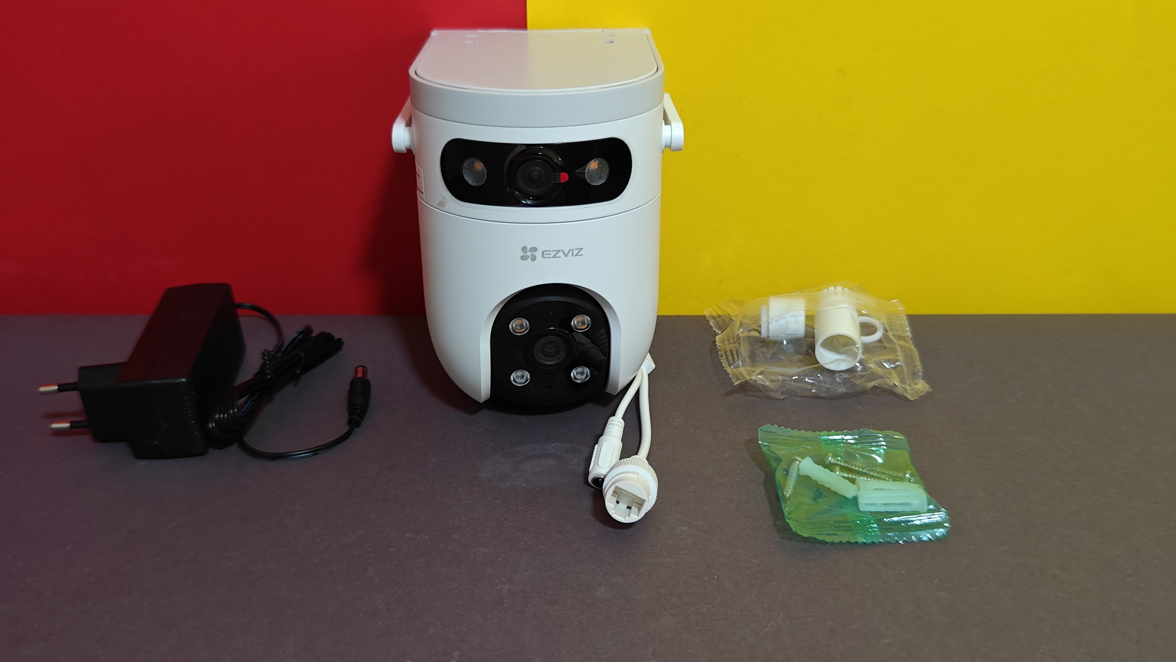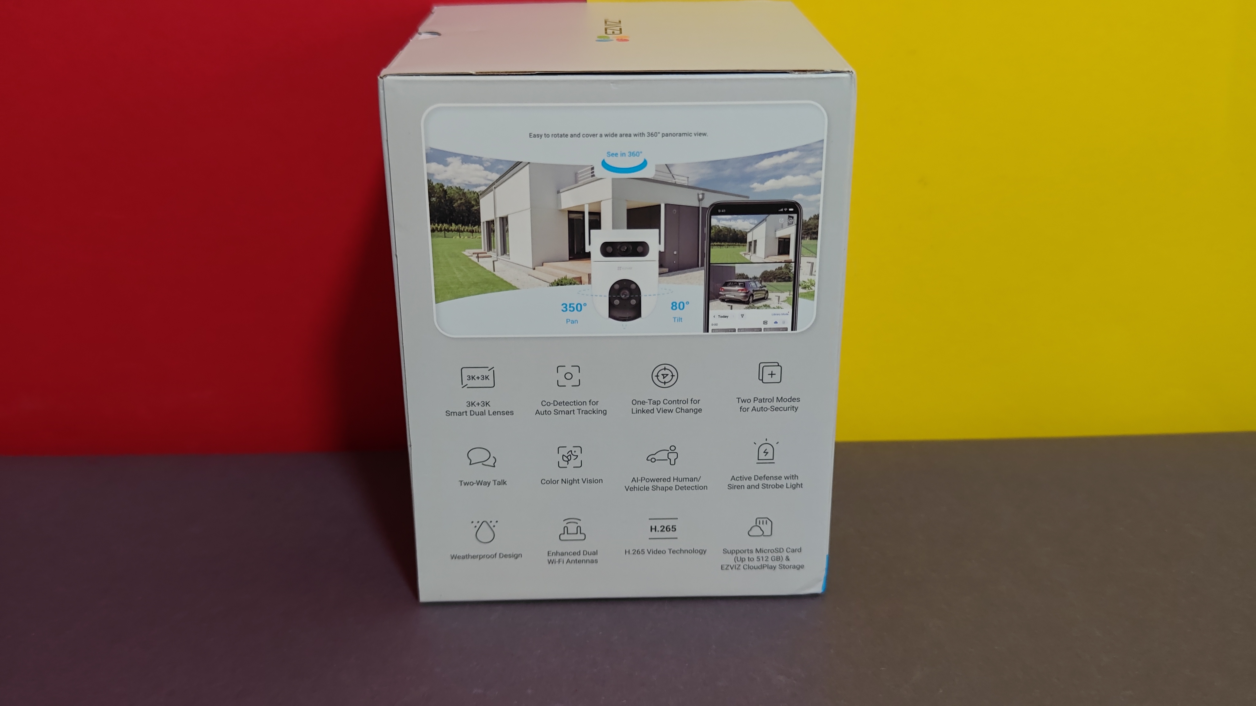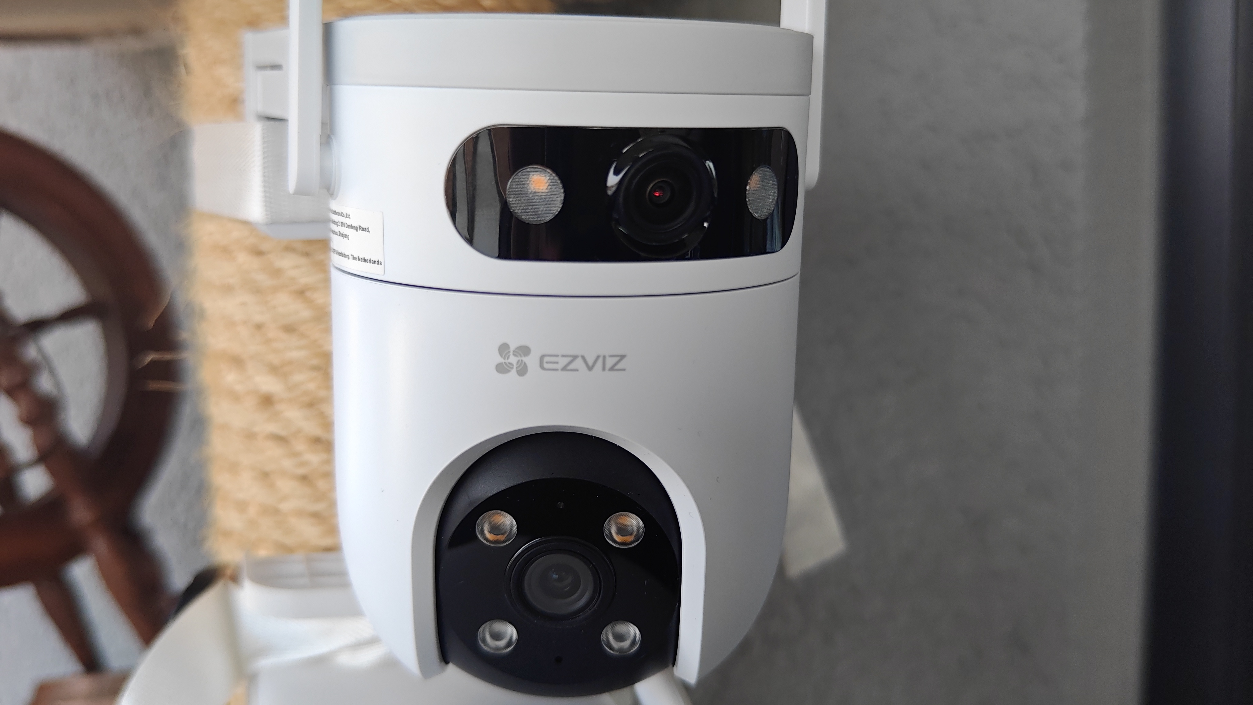 Das Objektiv bietet eine Brennweite von 3,6 Millimeter mit einer f/1,8-Blende. Standardmäßig bietet es ein Sichtfeld von 110° vertikal. Dank Schwenk- und Neigetechnik erweitert sich das Sichtfeld auf 355° horizontal und 120° vertikal. Damit bietet sie den typischen Rundumblick von PTZ-Überwachungskameras. Links und rechts neben dem Objektiv befindet sich LED- und PIR-Leuchten, die für eine farbige respektive schwarzweiße Nachtsicht sorgen. Mit einem Mikrofon neben dem Objektiv und einem Lautsprecher an der Unterseite realisiert die Kamera auch eine Gegensprechfunktion. Der Lautsprecher dient gleichzeitig als Sirene.