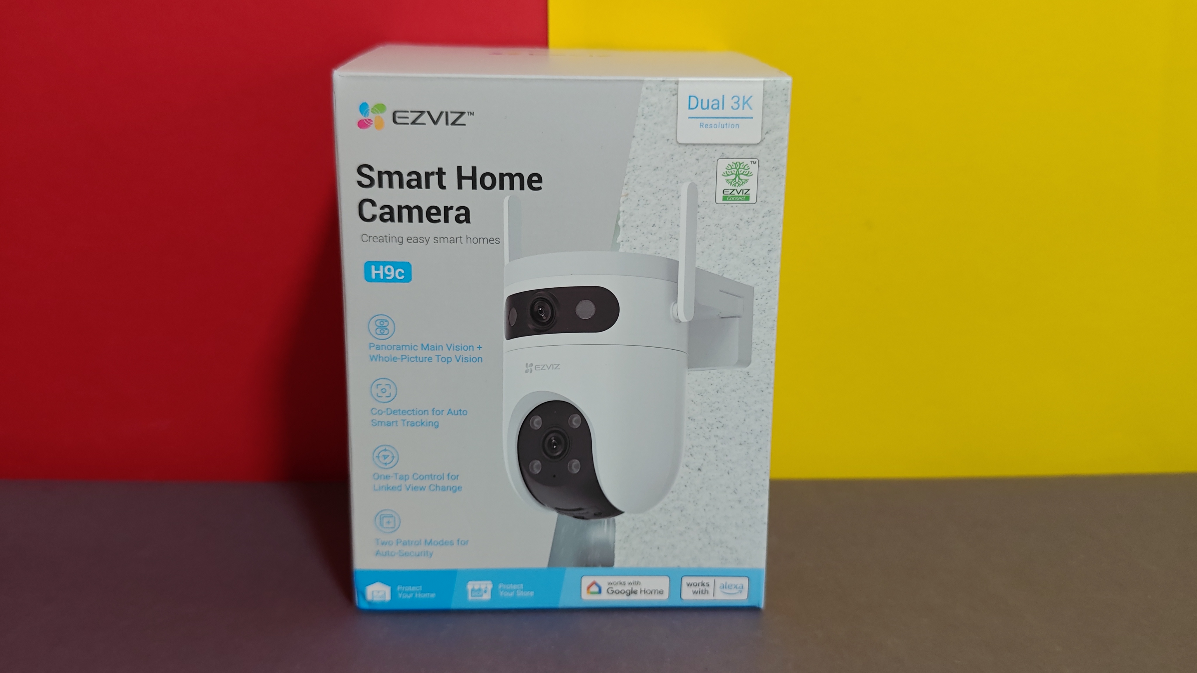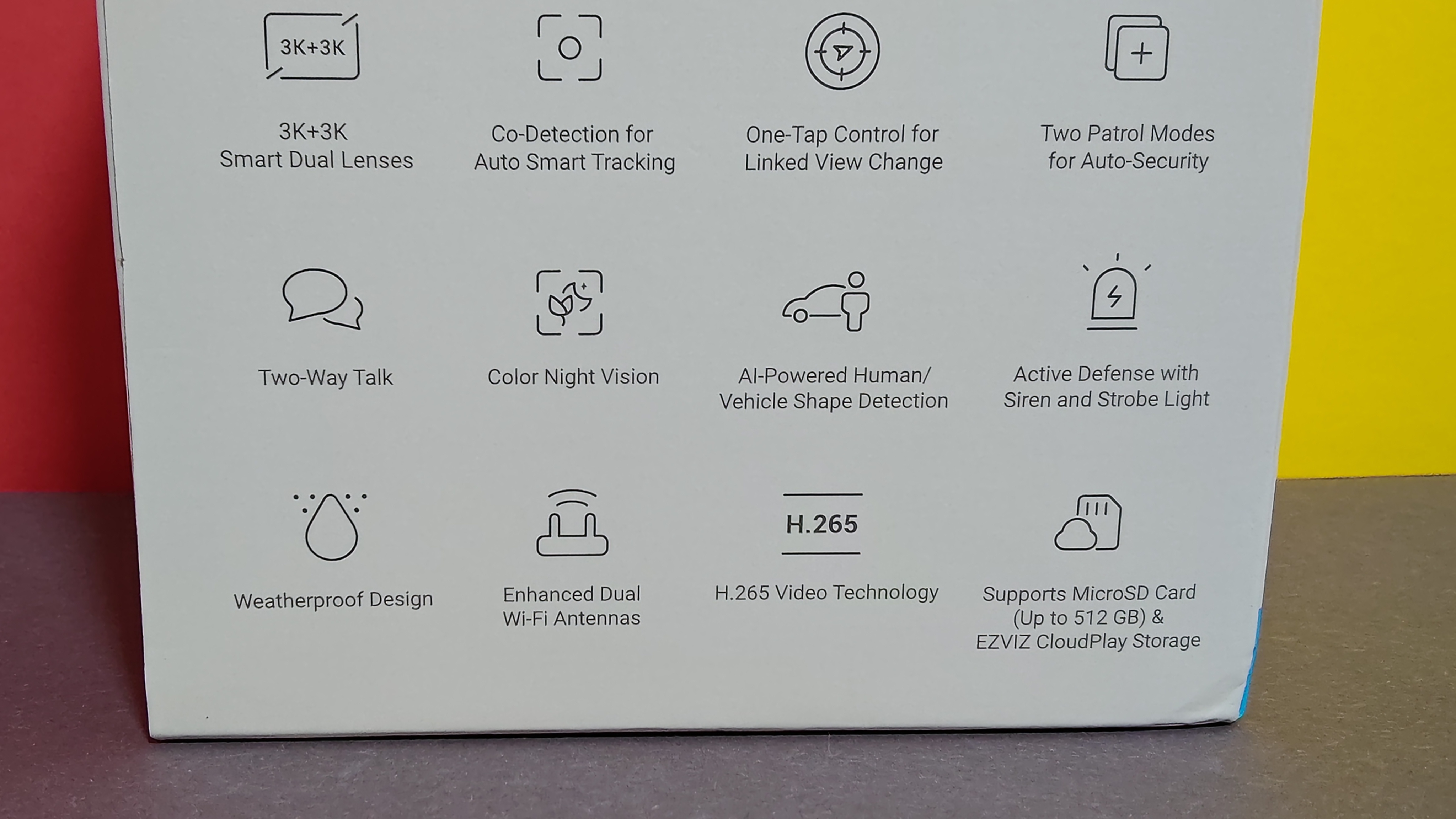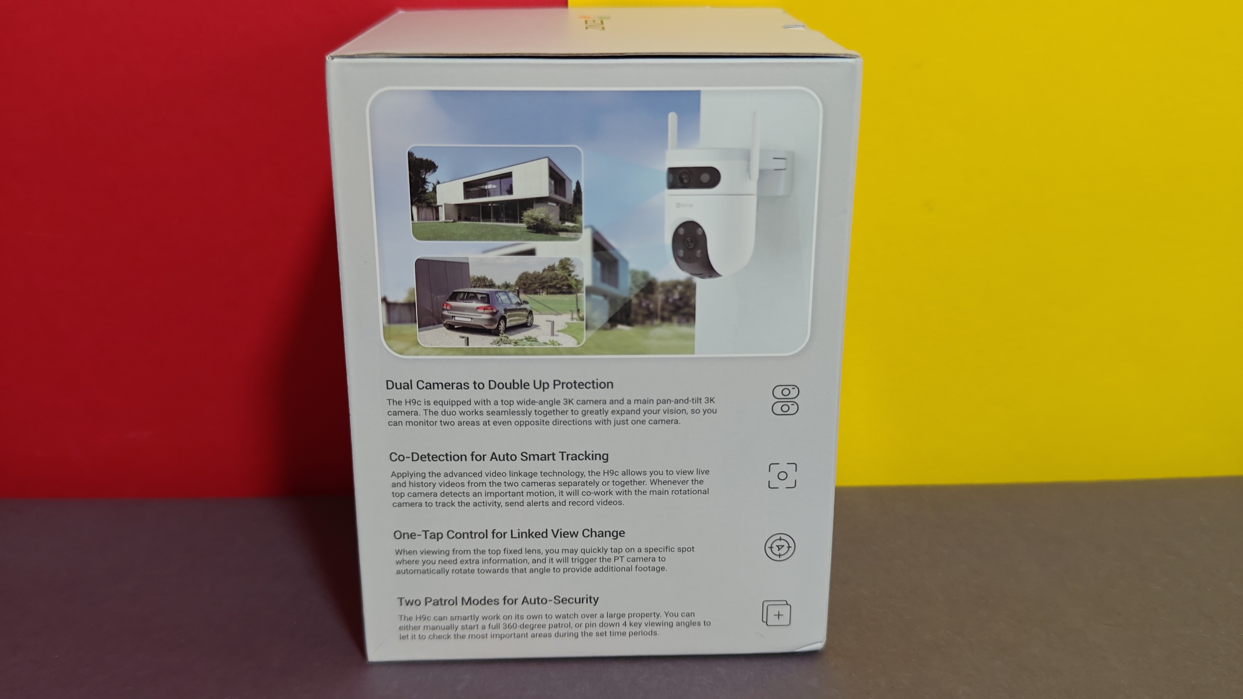 Das Objektiv bietet eine Brennweite von 3,6 Millimeter mit einer f/1,8-Blende. Standardmäßig bietet es ein Sichtfeld von 110° vertikal. Dank Schwenk- und Neigetechnik erweitert sich das Sichtfeld auf 355° horizontal und 120° vertikal. Damit bietet sie den typischen Rundumblick von PTZ-Überwachungskameras. Links und rechts neben dem Objektiv befindet sich LED- und PIR-Leuchten, die für eine farbige respektive schwarzweiße Nachtsicht sorgen. Mit einem Mikrofon neben dem Objektiv und einem Lautsprecher an der Unterseite realisiert die Kamera auch eine Gegensprechfunktion. Der Lautsprecher dient gleichzeitig als Sirene.
