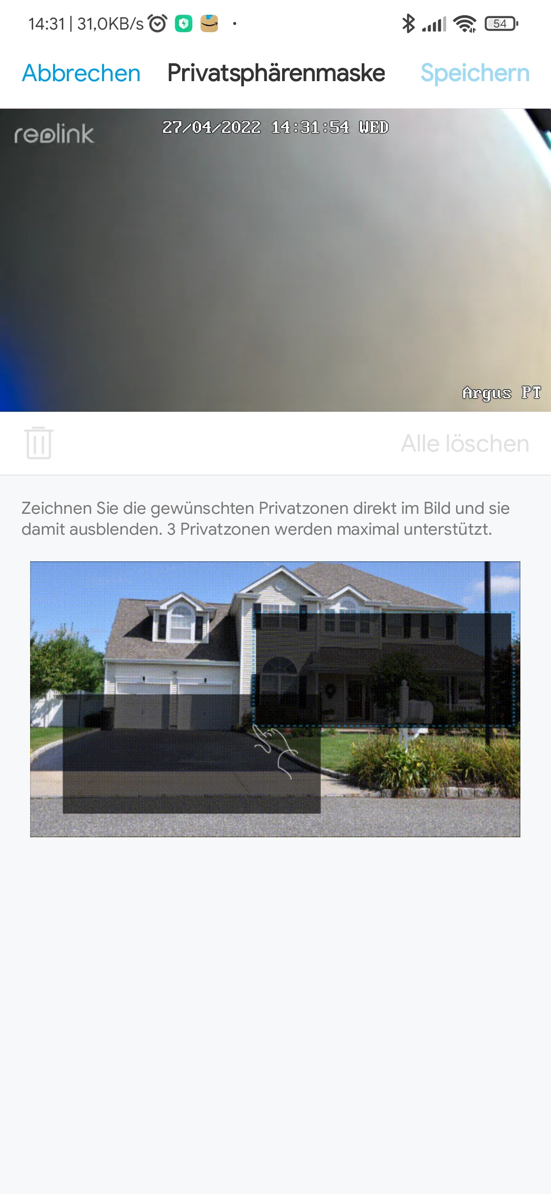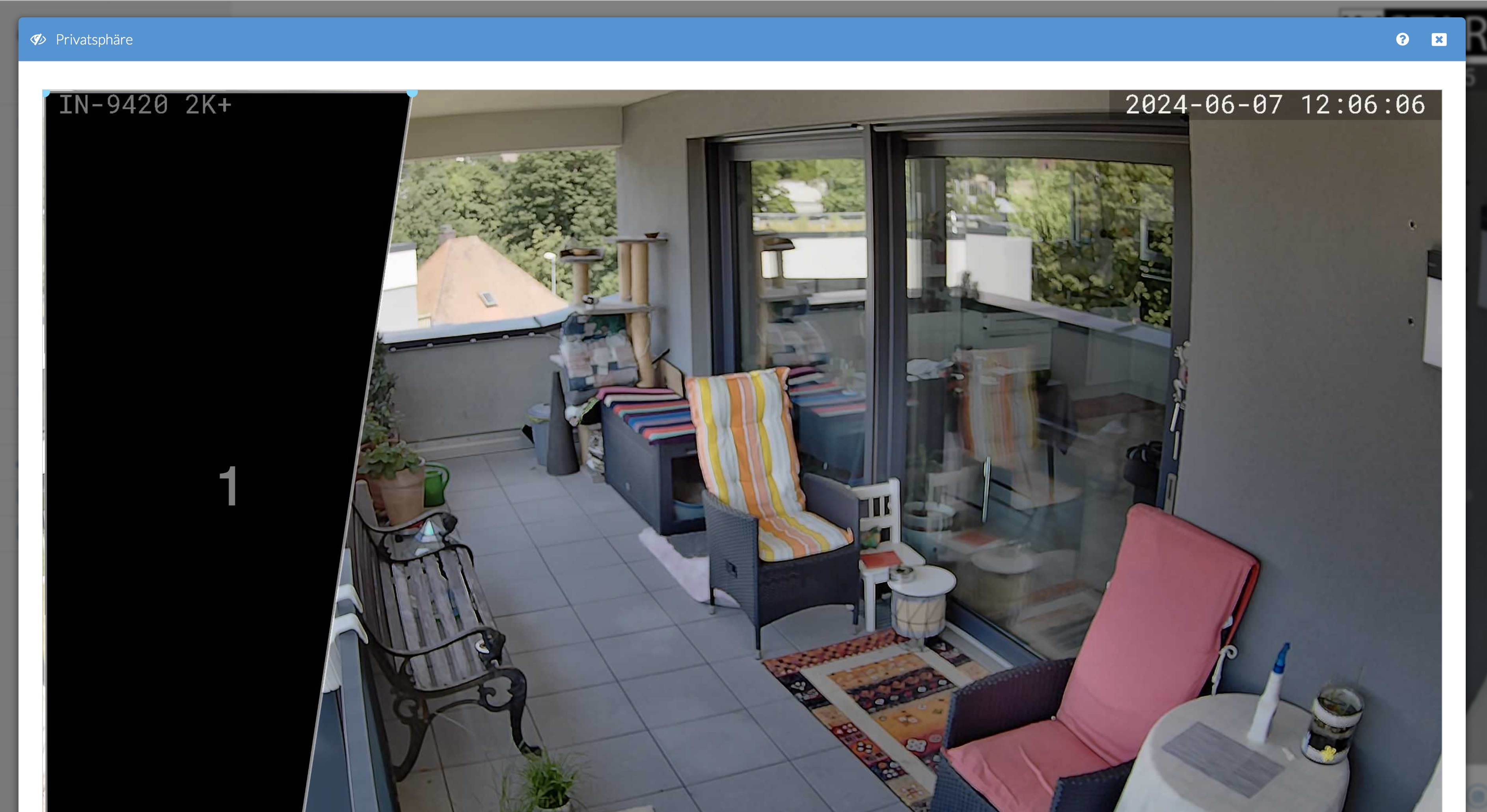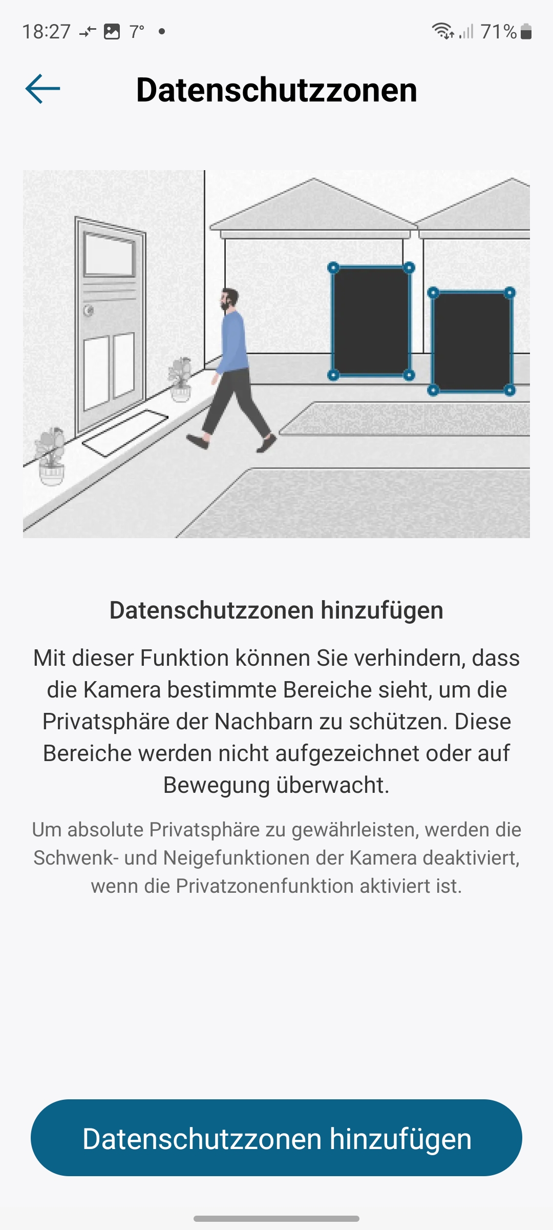 Für einen DSGVO-konformen Betrieb können Anwender unter Einstellungen – Display – Privatsphärenmaske bis zu drei Zonen definieren, die bei der Aufzeichnung automatisch geschwärzt werden. Das ist Voraussetzung für einen DSGVO-konformen Betrieb der Kamera, wenn sie auf fremde Grundstücke oder öffentliche Bereiche ausgerichtet ist.