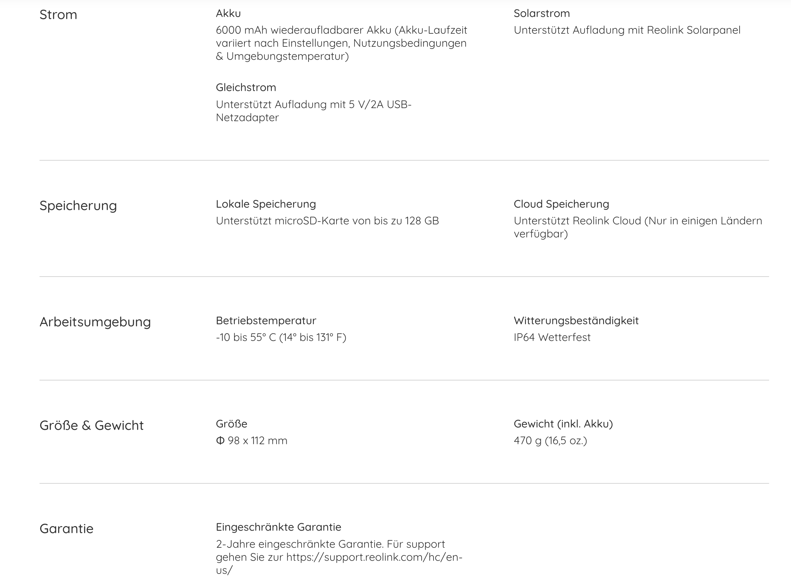 | Reolink Trackmix Akku, LTE | 355° | 2560 | 1440 | 3.686.400 | 15 fps | nein* |