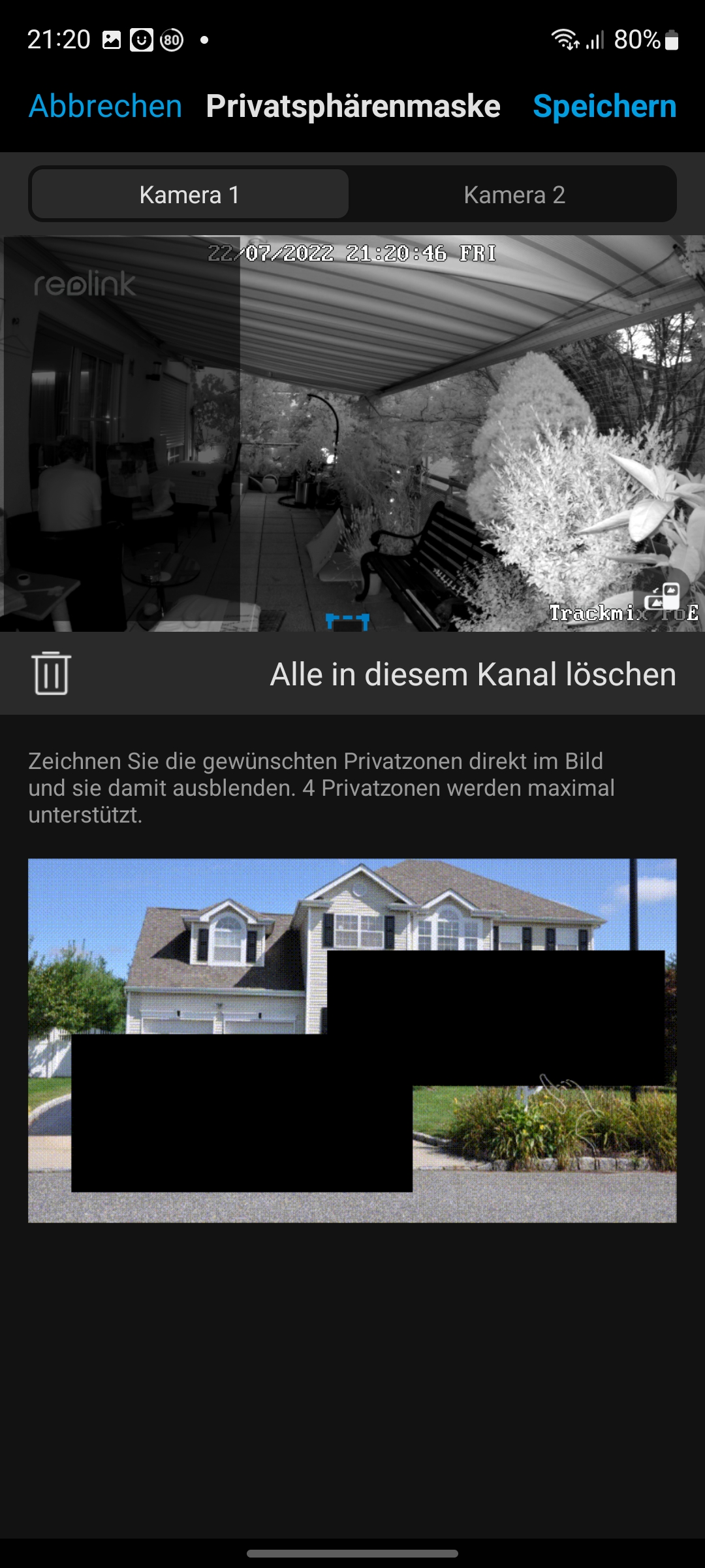Für einen DSGVO-konformen Betrieb erlaubt die Web-UI unter Einstellungen – Multimedia – Privatsphäre die Konfiguration von bis zu acht Bildbereichen, die bei der Aufnahme automatisch geschwärzt werden. Das ist etwa erforderlich, wenn die Überwachungskamera auf ein fremdes Grundstück oder öffentlichen Bereich ausgerichtet ist.