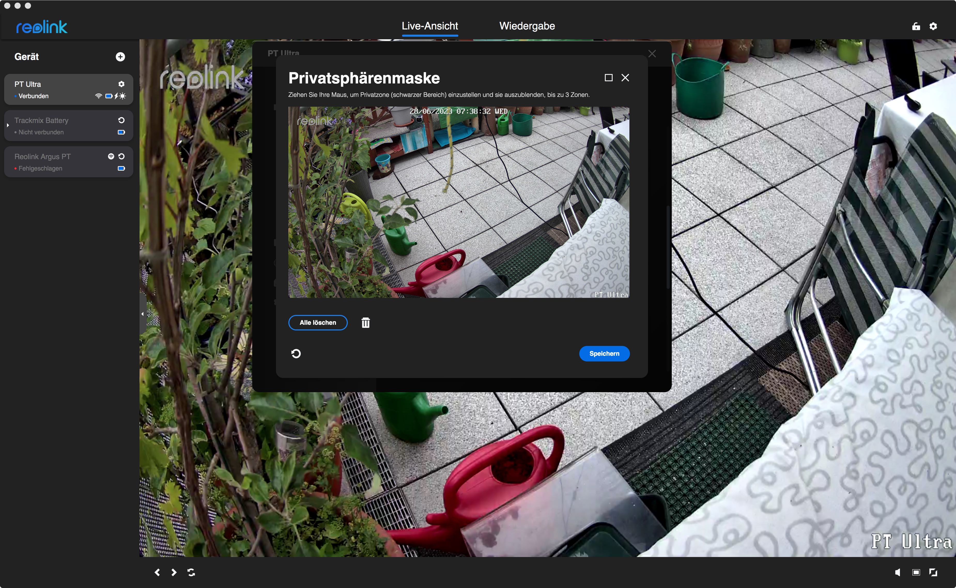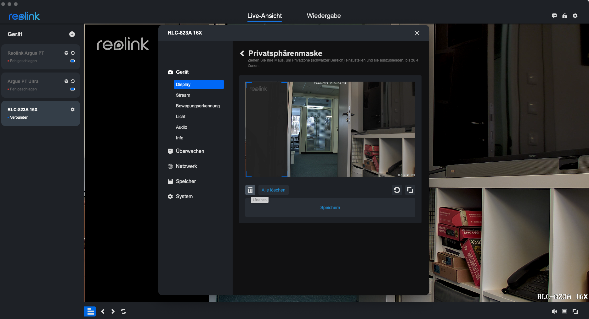 Über das Zahnrad-Symbol können Anwender mit der App oder der Desktop-Anwendung die Reolink Go PT Ultra umfangreich justieren. Im Abschnitt Display lässt sich etwa die Position von Kameraname sowie Datum und Zeit im Live-Bild verändern. Die Angaben kann man aber auch wie das Wasserzeichen vollständig ausblenden. Um die Überwachungskamera datenschutzkonform zu betreiben, wenn sie auf ein fremdes Grundstück oder einen öffentlichen Bereich ausgerichtet ist, können Anwender unter Privatsphärenmaske drei Zonen definieren, in denen keine Aufnahme erfolgt.