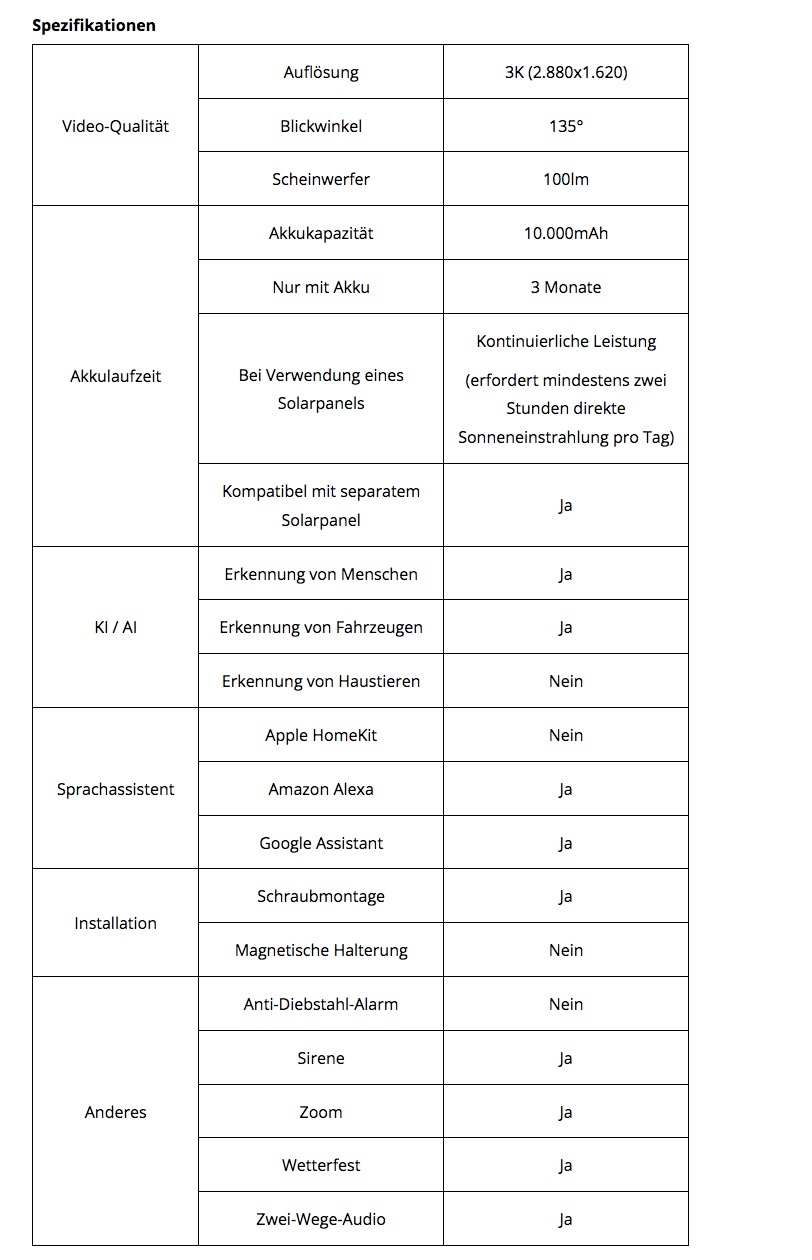 Dank Akkubetrieb und LTE können Anwender den Montageort für die Kamera unabhängig von einer Stromversorgung und WLAN-Netz wählen. Mit dem Solarpanel steigt die Flexibilität zusätzlich, da das Aufladen des Akkus die Sonne übernimmt. Somit muss man sie unter günstigen Bedingungen nicht einmal manuell laden. Die Aufnahmequalität ist gut, die Benachrichtigungen funktionieren zeitnah und zuverlässig. Fehlalarme sind dank umfangreicher Einstellmöglichkeiten und der Fähigkeit der Kamera zwischen Personen, Fahrzeuge, Tieren und anderen Objekten zu unterscheiden, nahezu ausgeschlossen.