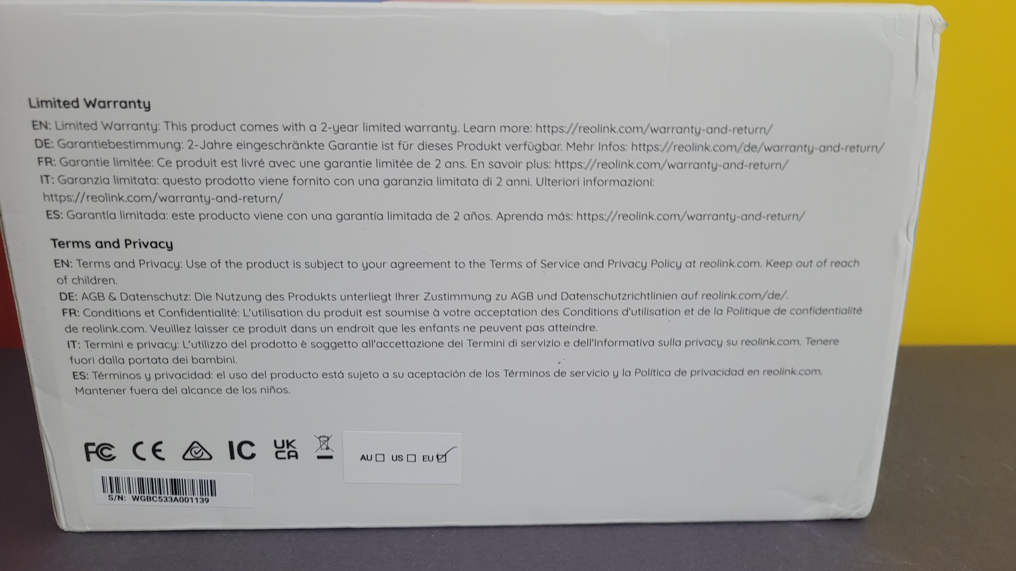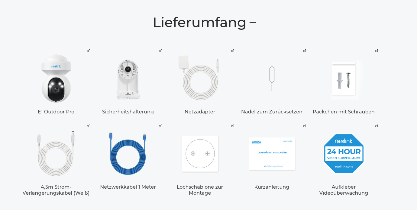 Der Lieferumfang umfasst neben der Kamera eine Metallhalterung zur Montage an einer Wand. Außerdem befinden sich im Karton noch eine Montageschablone, Schrauben und Dübel zur Befestigung, einen Draht mit Karabinerhaken für die Montage, einen Aufkleber mit Hinweis zur 24-Stunden-Überwachung sowie eine Kurzanleitung – auch auf Deutsch, die primär Montage und Inbetriebnahme erläutert. Letztere erfolgt am besten mit dem mitgelieferten Ethernet-Kabel, sodass das Abscannen des am Kameragehäuse aufgedruckten QR-Code entfällt. Das Setup der Kamera mit der Reolink-App oder mit einem Browser ist schnell erledigt. Mehr Details dazu finden Interessierte in älteren Testberichten über Reolink-Kameras (Themenwelt), in denen wir die Inbetriebnahme detailliert erläutert haben. Alternativ zur PoE-Stromversorgung befindet sich im Lieferumfang noch ein 24-Watt-Netzteil, das aber nur ein 1,5 Meter langes Verbindungskabel bietet.
