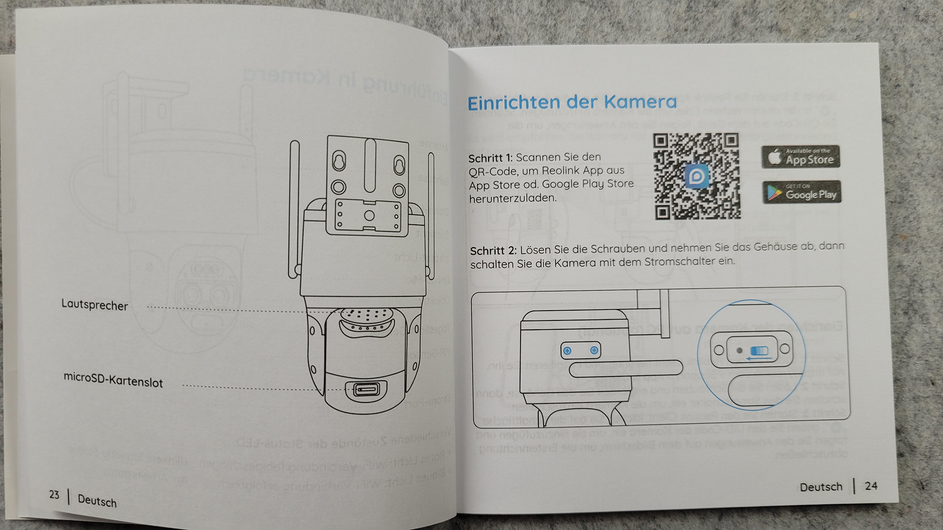 Die Inbetriebnahme der Reolink Trackmix PoE ist prinzipiell einfach. Man muss eine microSD-Karte einsetzen und mit der App, die auch ohne Nutzerkonto funktioniert, den QR-Code auf der Kamera einlesen und ein Gerätepasswort vergeben, fertig. Anschließend ist die Kamera einsatzbereit und per Smartphone-App steuerbar.