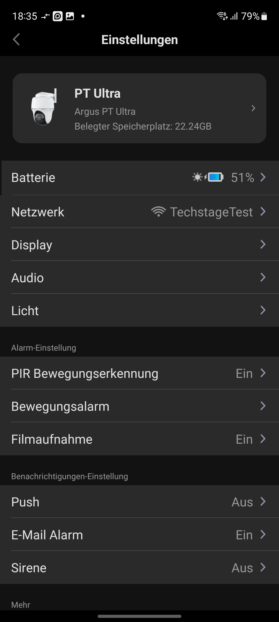 Fehlalarme treten dank der integrierten KI, mit der sich die Erkennung auf Personen, Fahrzeuge und Haustiere sowie nach deren Größe eingrenzen lässt, im Test nahezu keine auf. Benachrichtigungen in Form von Pushnachrichten und E-Mails erfolgen zeitnah. Die E-Mail-Benachrichtigungen sind bei uns allerdings im Spam-Ordner gelandet. Zudem funktionieren sie nicht, wenn das E-Mail-Konto über eine Zwei-Faktor-Authentifizierung abgesichert ist. Zusätzlich können Anwender optional den internen Lautsprecher als Sirene für einen Alarm verwenden. Allerdings ist diese mit gemessenen 80 dB direkt am Lautsprecher wie schon bei der Argus PT Ultra nicht sehr laut.