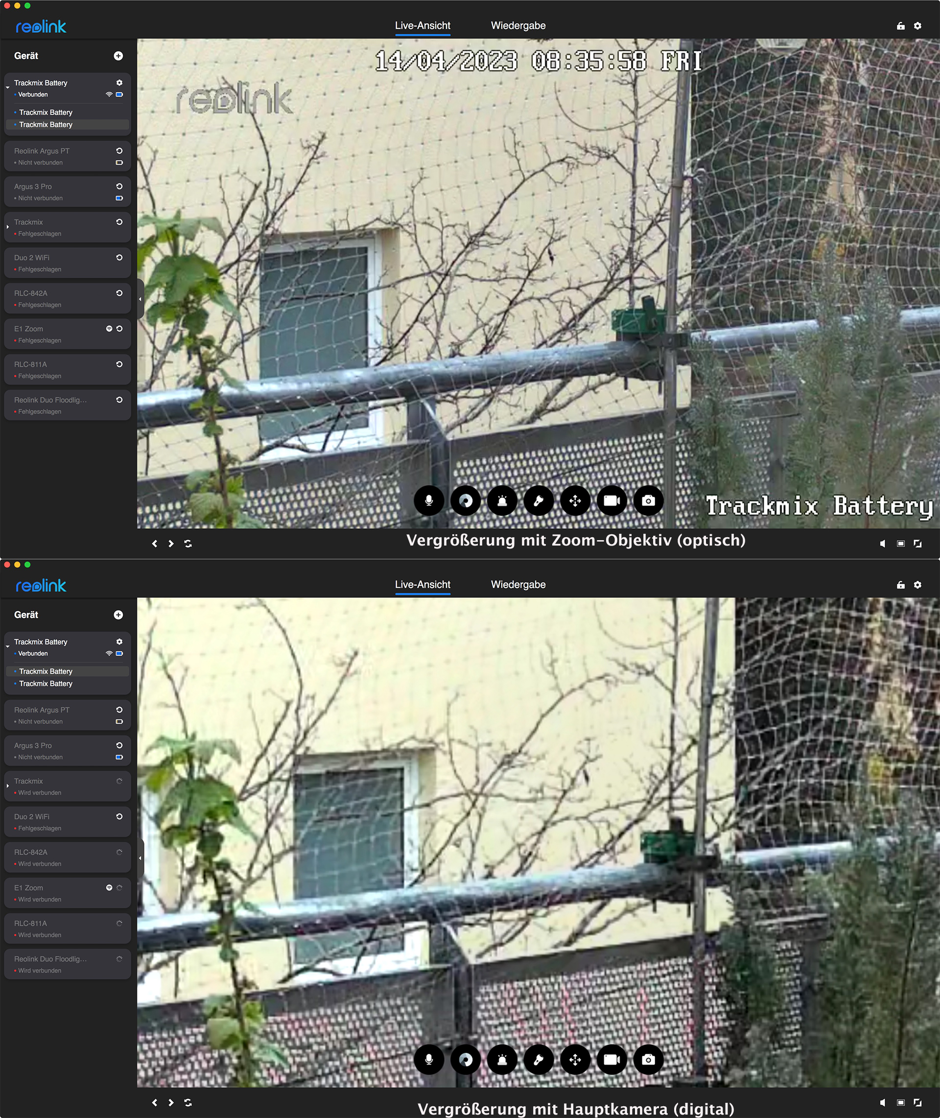Noch bessere Ergebnisse bei der Vergrößerung von Bildausschnitten bieten Überwachungskameras mit optischer Zoom-Funktion. Anders als beim digitalen Zoom gelingt damit eine Vergrößerung ohne Qualitätsverluste. Unser Testsieger, die Reolink RLC-823A 16x, bietet einen 16-fach-Zoom und kann selbst weit entfernte Objekte ganz nah heranholen – beeindruckend.