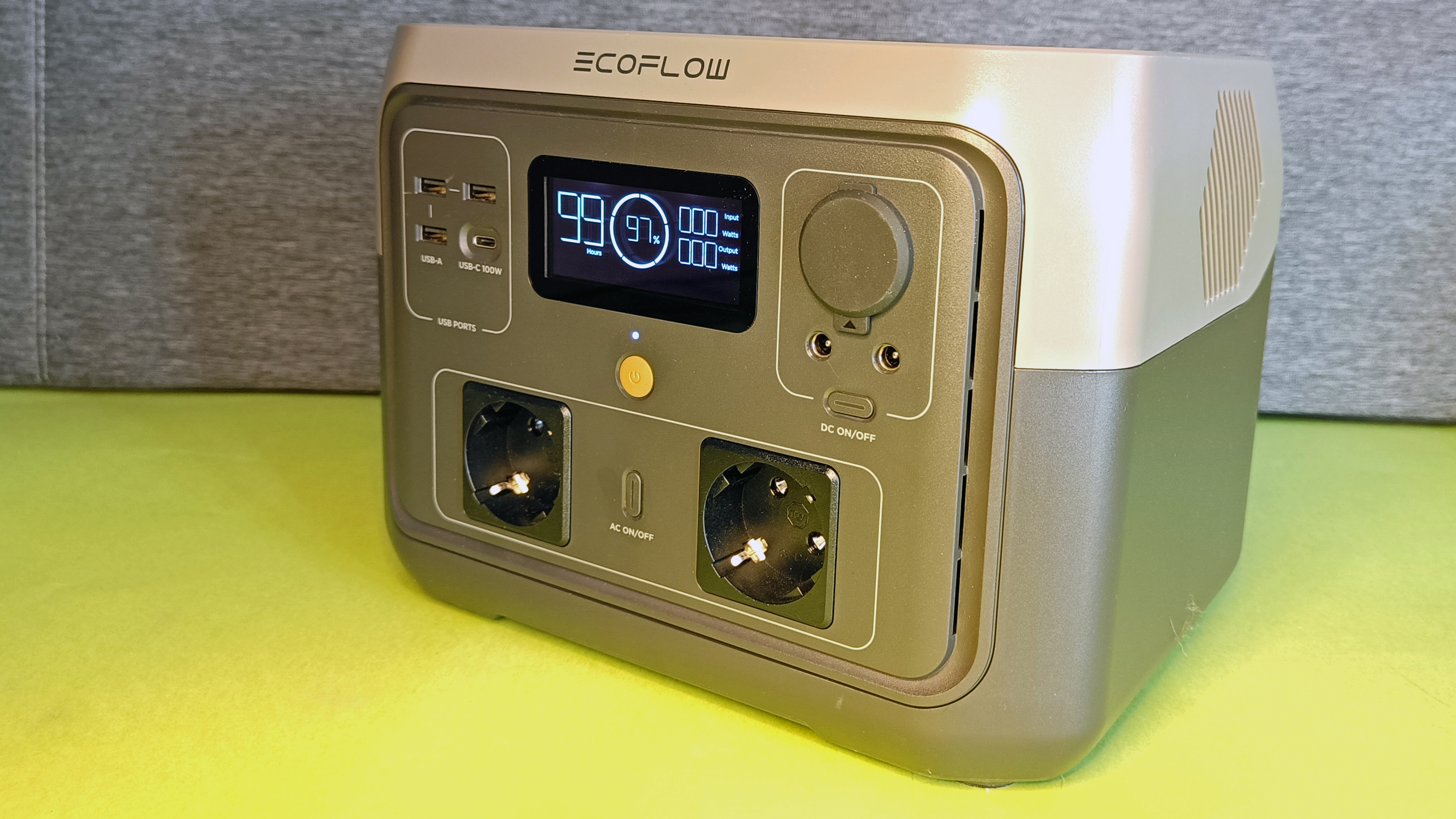 Mit einer AC-Ausgangsleistung von 300 Watt sind bei der River 2 dank Boost-Funktion bis zu 600 Watt an 230-Volt-Steckdosen möglich. Die interne Kapazität liegt bei 256 Wh. Beide USB-A-Ausgänge liefern bis zu 12 Watt, der USB-C-Slot sogar 60 Watt. Auch eine 12-Volt-Dose für Kfz-Zubehör (Zigarettenanzünder) und eine Notlampe sind vorhanden. Dank Schnellladefunktion ist die River 2 in nur einer Stunde voll aufgeladen – zumindest per Netzteil. Der maximale Ladestrom per Solar liegt bei 8 Ampere und so dauert das Aufladen per Solarpanel rund 3 Stunden – entsprechend starke Panels und direkte Sonneneinstrahlung vorausgesetzt.