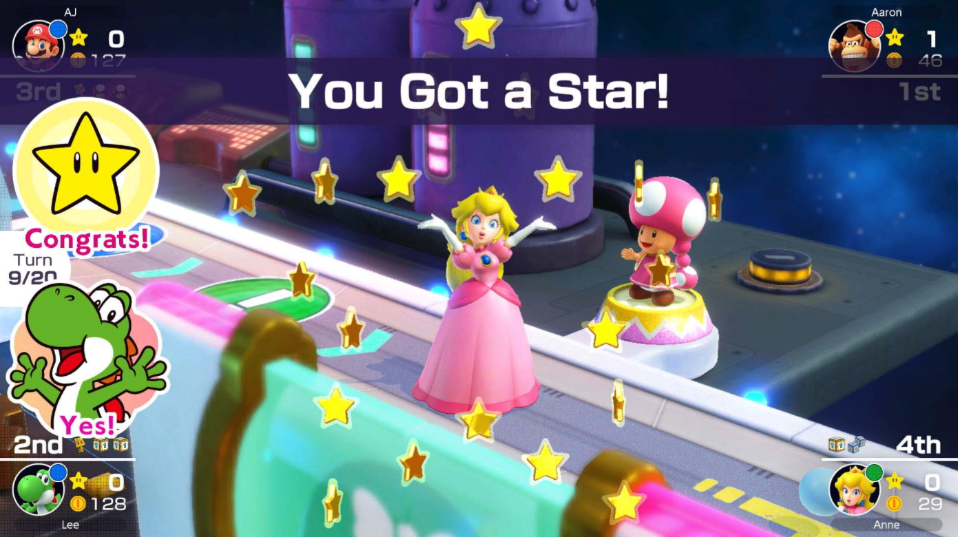 Der Mario-Party-Modus widmet sich dem besagten Brettspiel, bei dem sich Spieler mithilfe eines Würfels über die bunten Bretter fortbewegen. Jede Runde wird mit einem Minispiel abgeschlossen, bei denen Spieler um eine gewisse Anzahl von Münzen gegeneinander antreten. Wer sich am Ende des Spiels mit Münzen die meisten Sterne ergattern konnte, der gewinnt.