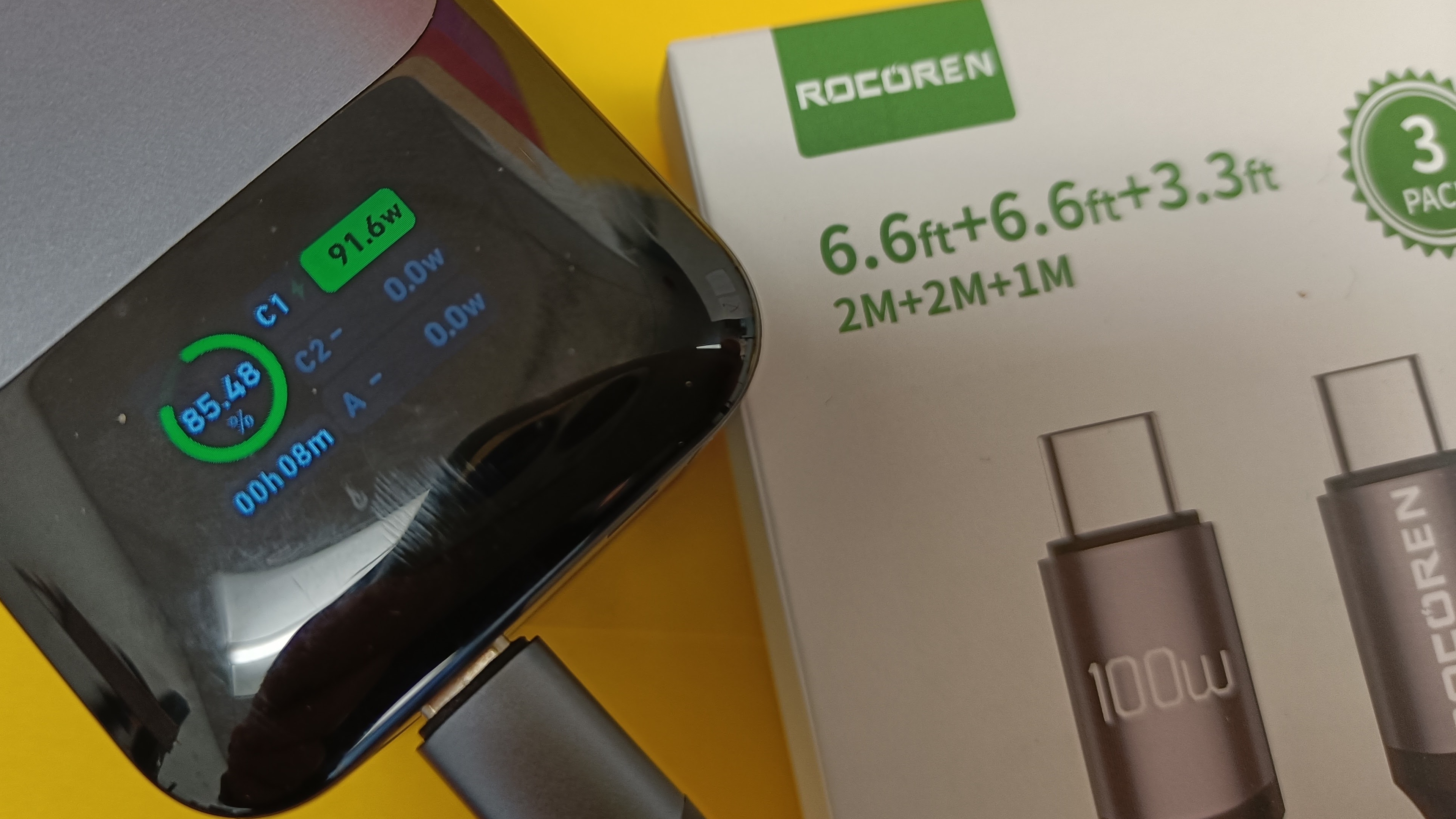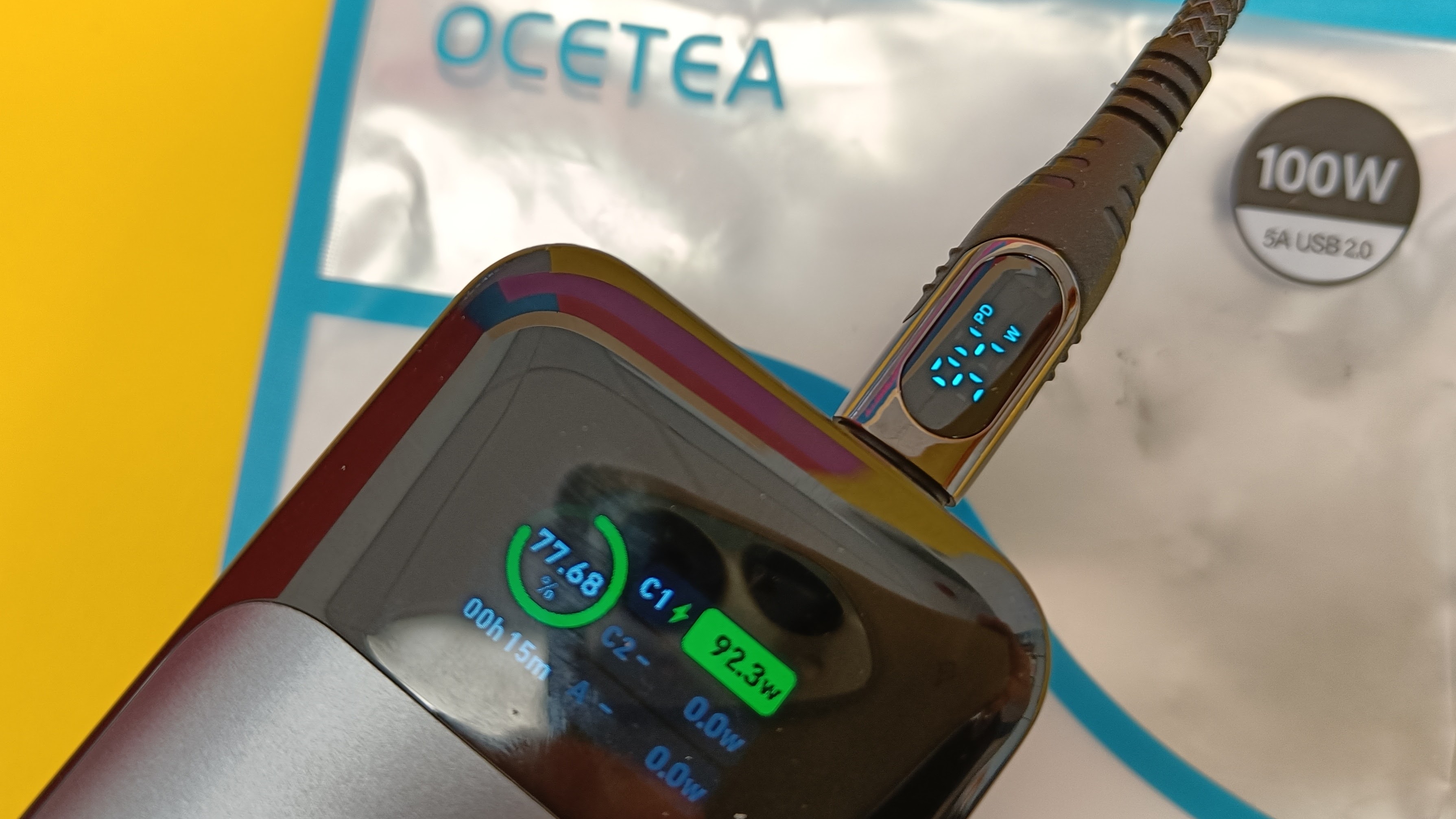 Auch das Kabel von Ocetea für aktuell 6,50 Euro hat ein kleines Display mit Leistungsanzeige an Bord. Das einen Meter lange Kabel ist dank Textilmantel stabil, aber etwa starrer als andere Modelle. Für Schlafzimmer & Co. wäre uns die Anzeige allerdings zu hell.