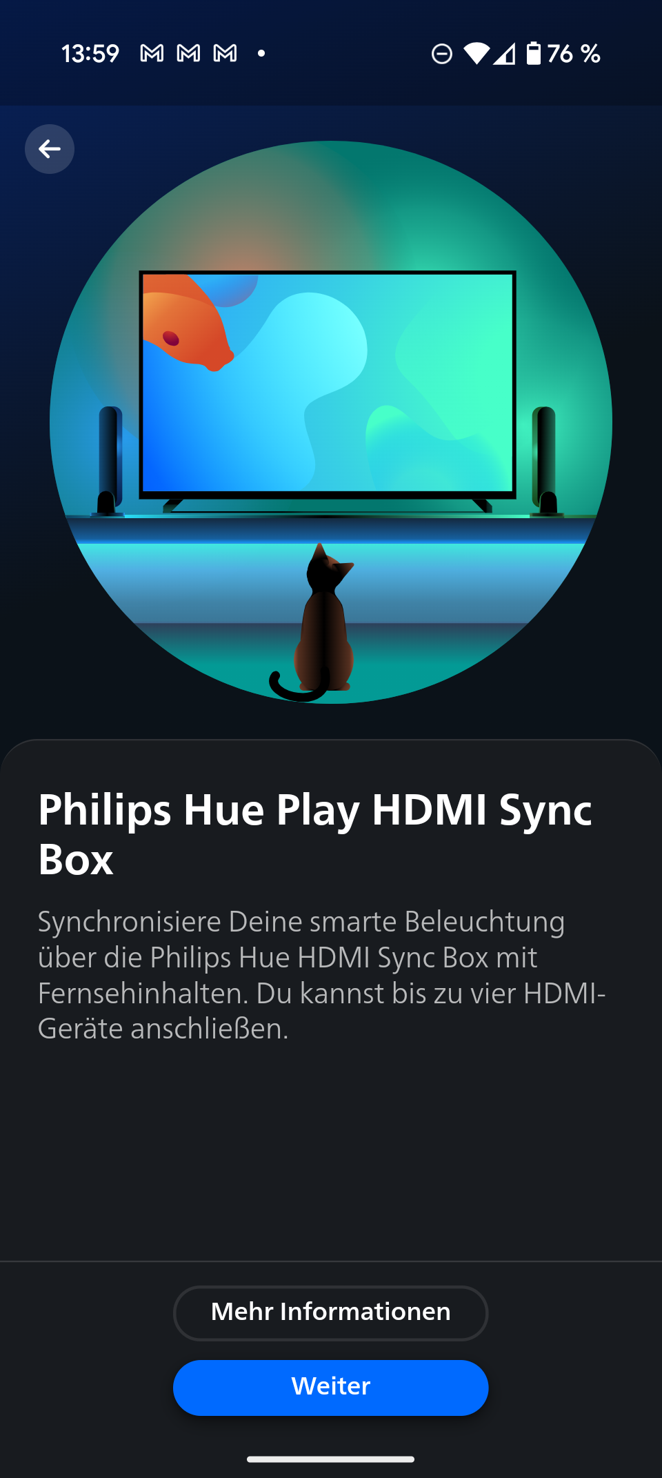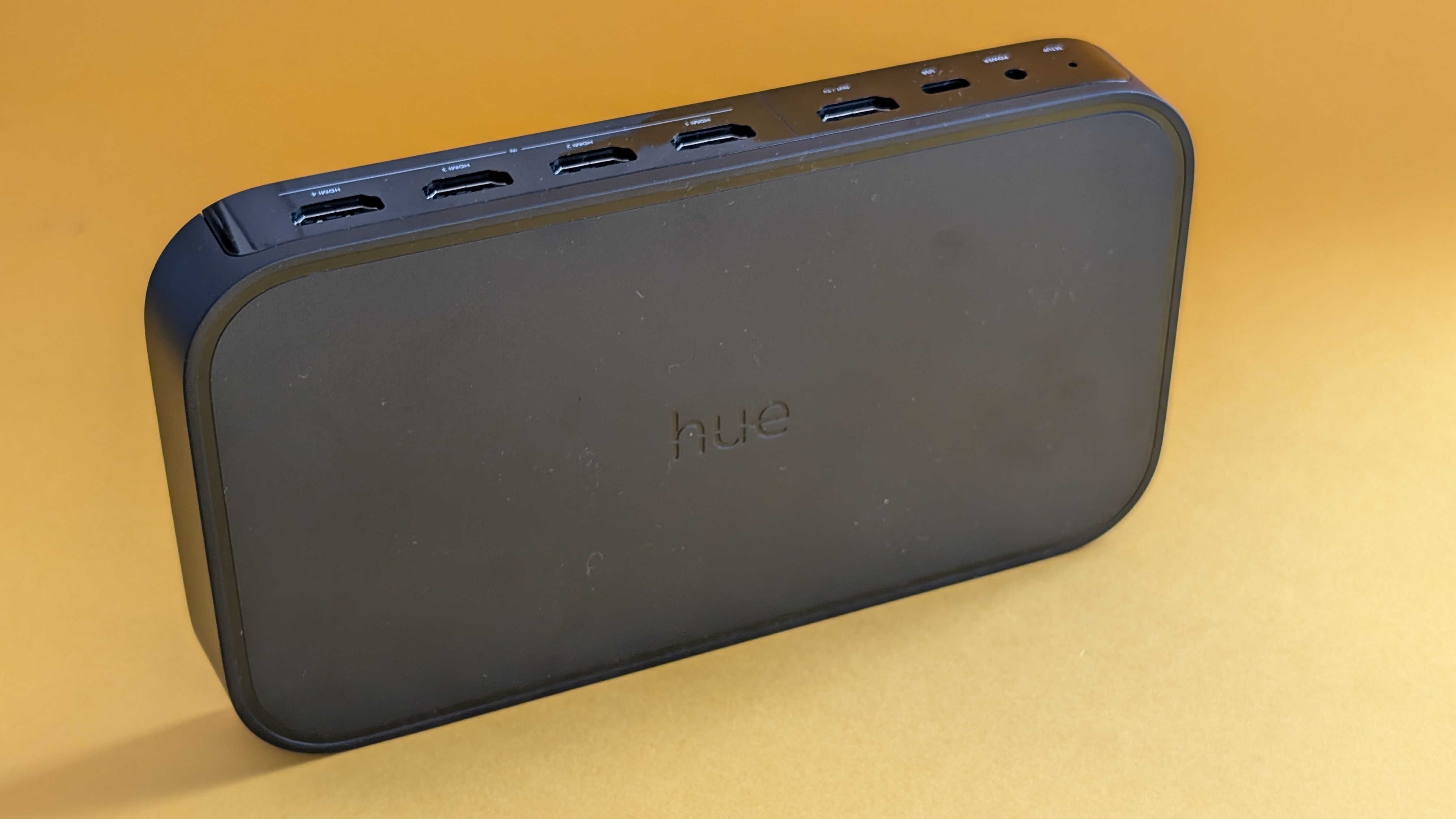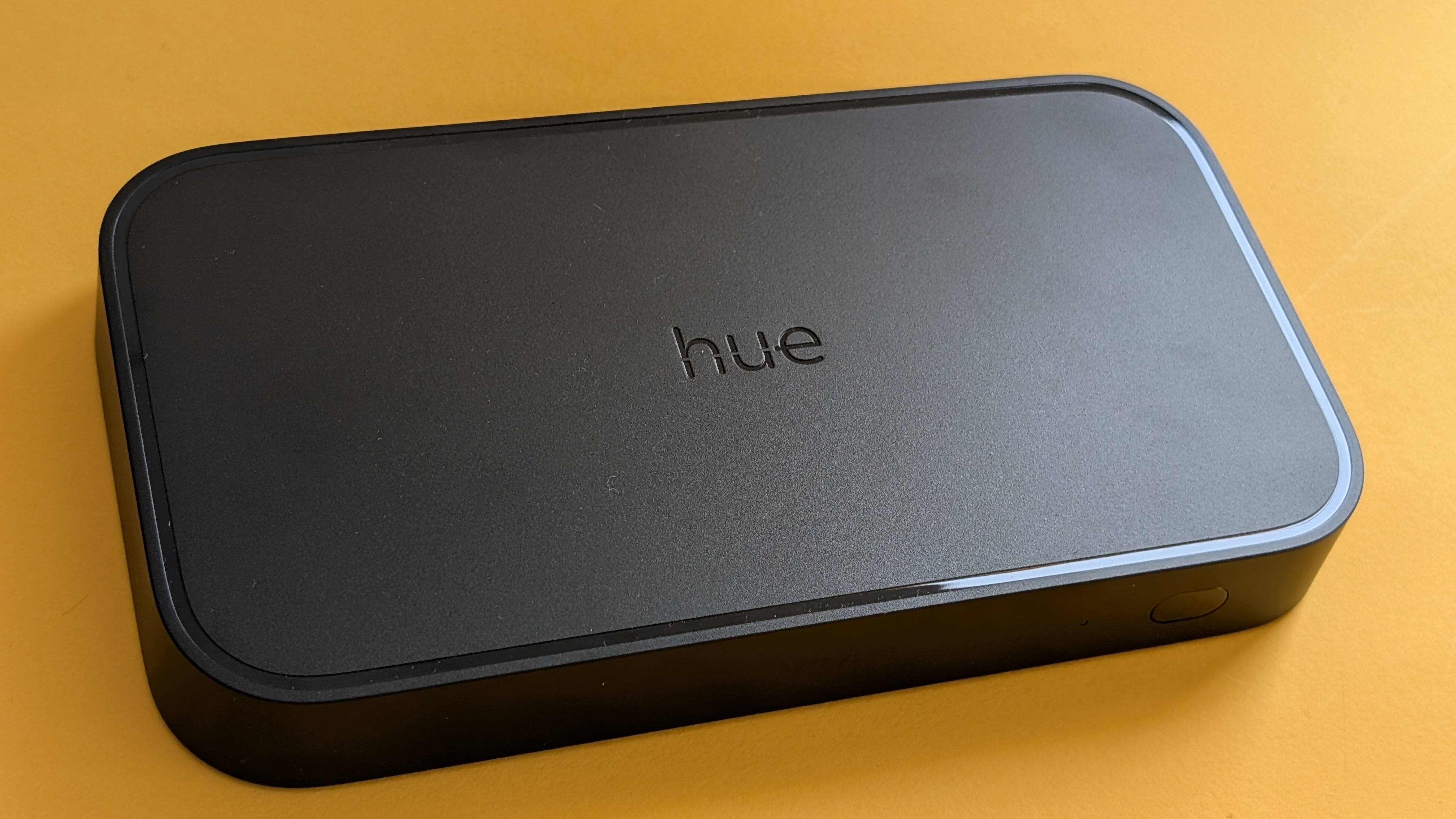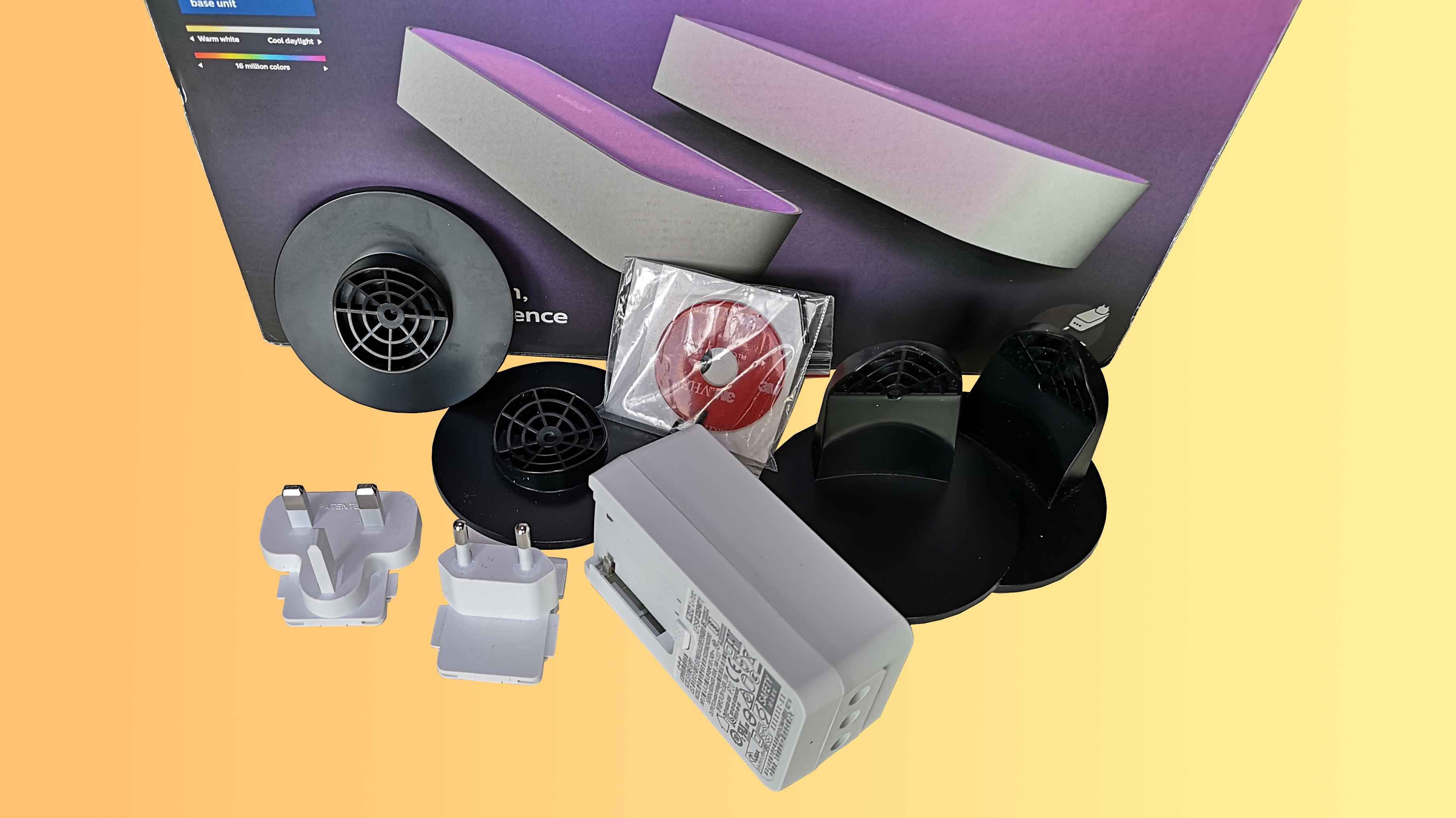 Zum Lieferumfang gehören neben der Sync Box ein 1 Meter langes HDMI-2.1-Kabel, ein 24-Watt-Netzteil mit Adaptern für Deutschland und Großbritannien sowie eine Kurzanleitung. Für den Betrieb ist zwingend eine Hue Bridge erforderlich, die separat erworben werden muss. Außerdem benötigt man für die Lichtsynchronisation kompatible Hue-Leuchten wie der hinter dem Fernseher zu montierende Gradient Lightstrip.