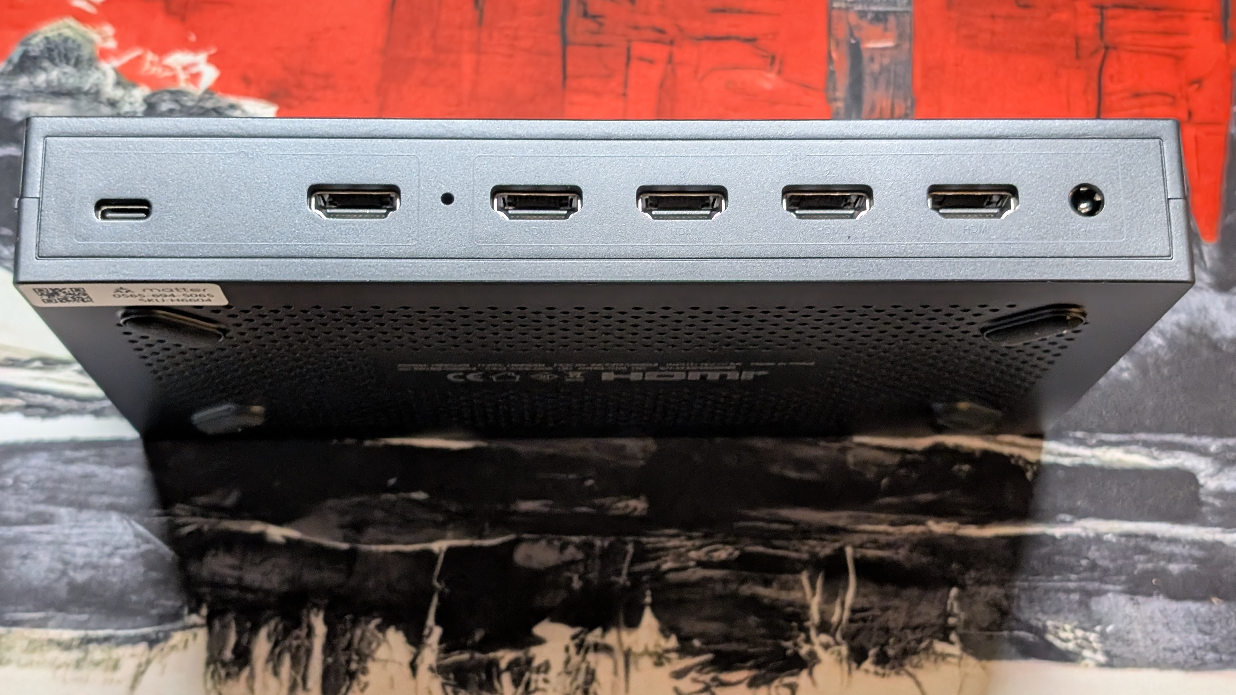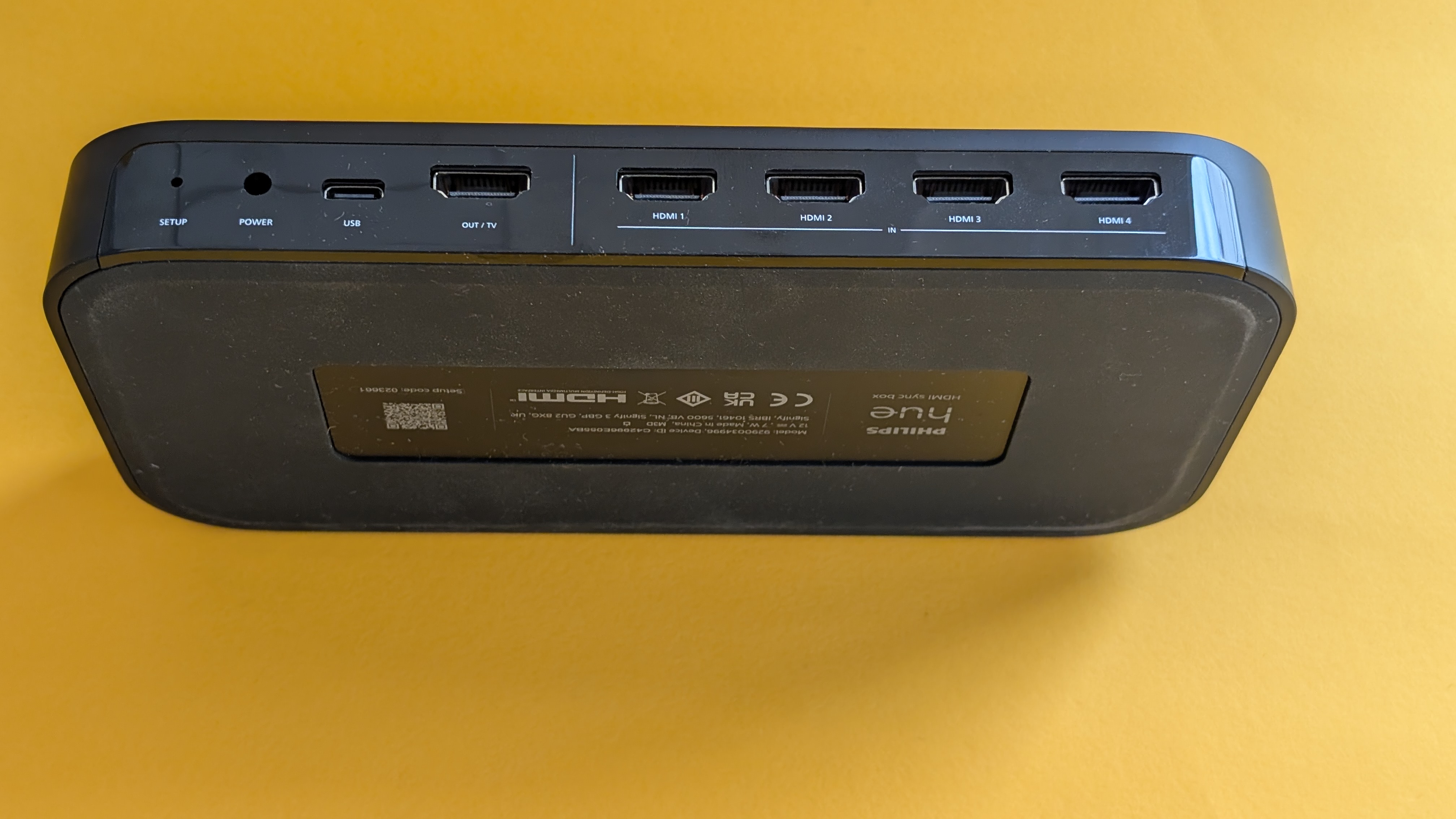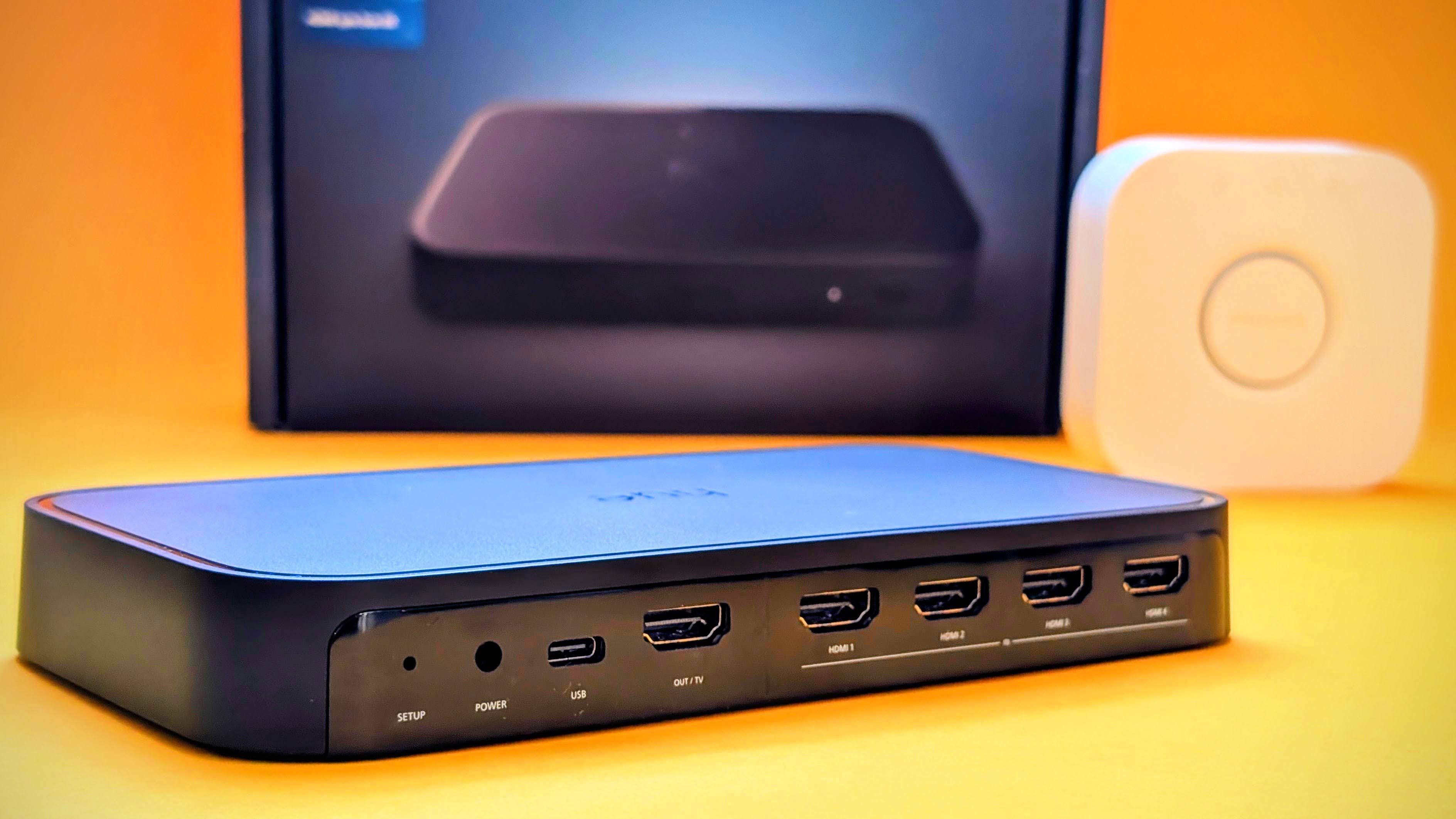 Die Sync Box 8K ähnelt optisch dem Vorgängermodell, hat aber einen dezenten glänzenden Ring am Rand der Oberseite. Mit Abmessungen von 200 × 108 × 25 mm passt sie locker unter oder hinter die meisten Fernseher. An der Rückseite befinden sich vier HDMI 2.1 Eingänge zum Anschluss von Konsolen und Mediaplayern sowie ein HDMI-Ausgang für die Verbindung zum TV. Zusätzlich gibt es einen USB-C-Anschluss, einen Stromanschluss und eine Reset-Taste.