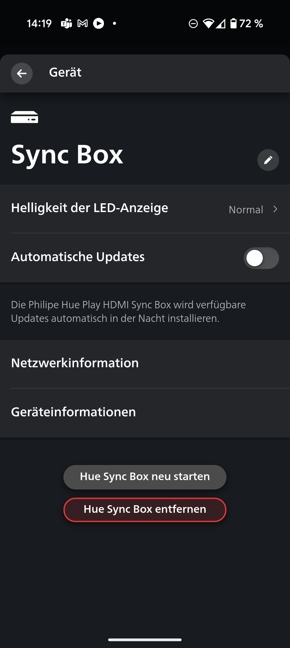 Dank HDMI 2.1 unterstützt die Sync Box 8K Auflösungen bis 4K bei 120 Hz oder 8K bei 60 Hz sowie VRR (Variable Refresh Rate) für Konsolen. HDR inklusive Dolby Vision wird ebenso unterstützt wie eARC für Dolby Atmos Sound. Die Box synchronisiert Farben und Helligkeit von bis zu zehn Hue-Leuchten in Echtzeit mit dem Bildschirminhalt. Der ARC-Bypass am HDMI-Eingang 4 ermöglicht die Integration mit AV-Receivern und Soundbars. Für den vollen Funktionsumfang ist allerdings ein 120-Hz-fähiger Fernseher und ein entsprechender Zuspieler nötig. Mit Smart-TV-Apps funktioniert die Synchronisation nicht, schließlich kann man hier die Sync Box 8K nicht dazwischenschalten. Ausnahmen bilden hier einige Smart-TVs von Samsung und LG, auf denen die Hue Sync TV App läuft.