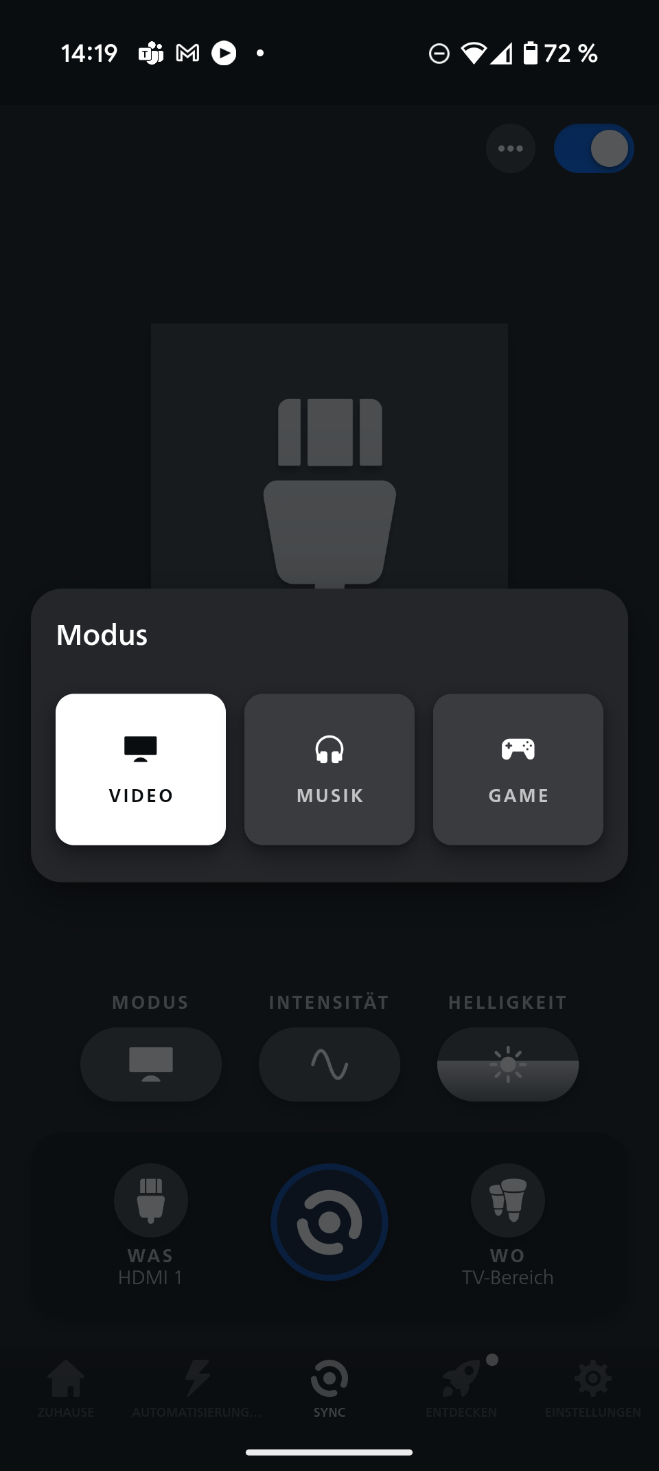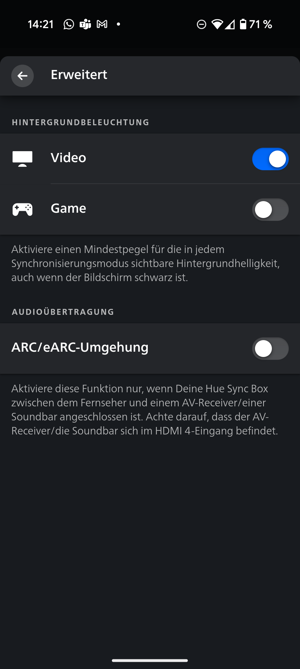Anhand der Kategorie „Musik“ wird Hue Sync dazu angehalten, Farben nicht mehr anhand des gezeigten Bildes, sondern zum Takt und der Art der Musik zu verwenden. Früher hieß das mal Lichtorgel und war ein Hit auf jeder Party.