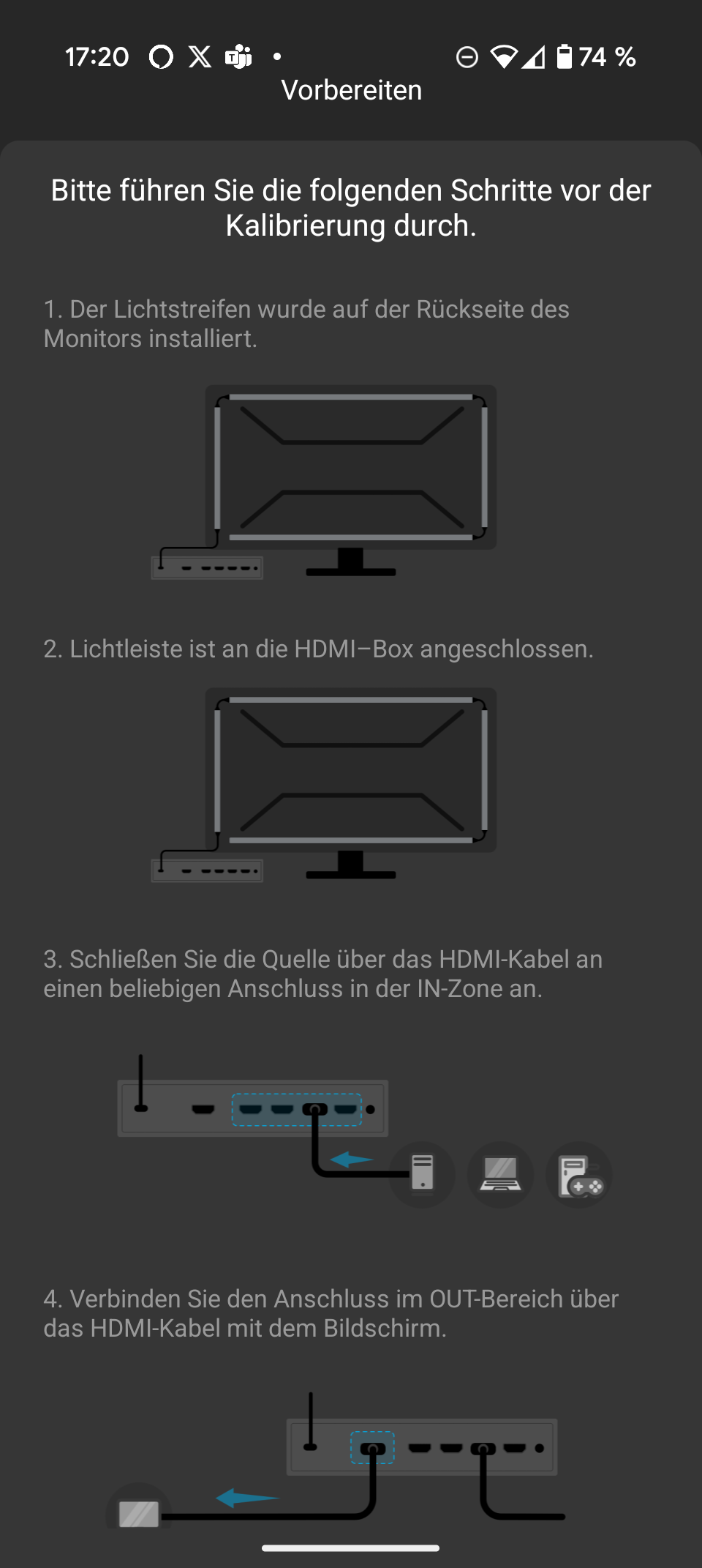 Im nächsten Schritt verbindet man den LED-Streifen via USB-C, die HDMI-Zuspieler und den Fernseher mit der Sync Box und schließt das Netzteil an. Die weitere Einrichtung erfolgt über die Govee Home App. Insgesamt ist die Installation auch für technisch weniger versierte Nutzer machbar.