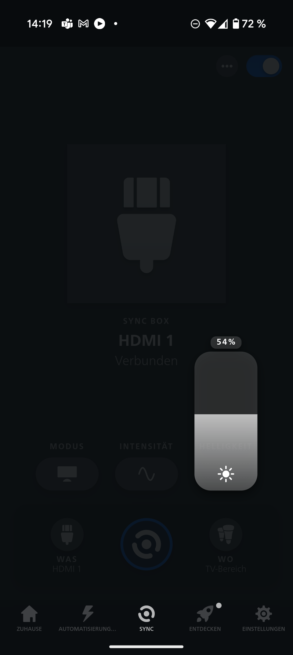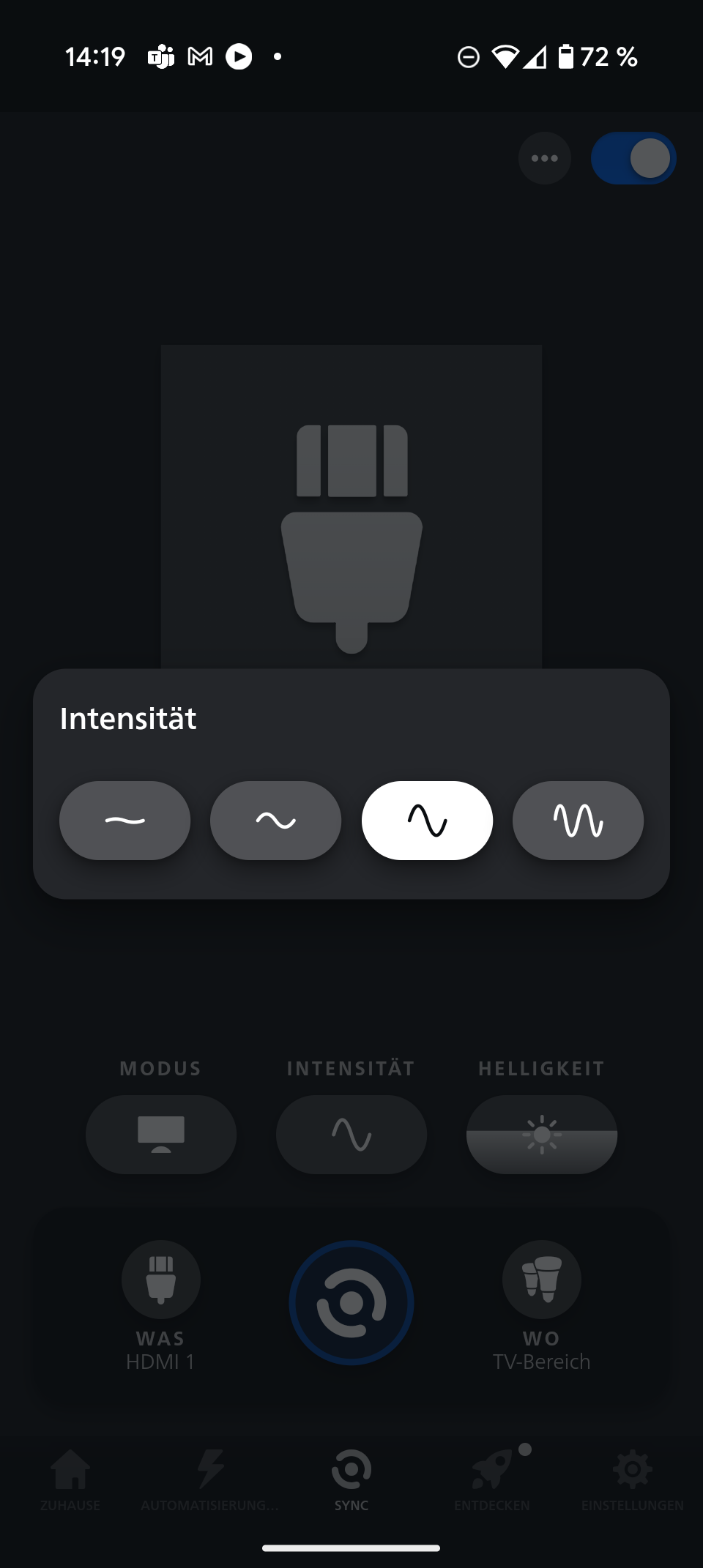 Hinzu kommt, dass bei schnellen Farbwechseln eine leichte Verzögerung zu erkennen ist, die schnell störend wirkt. Das lässt sich bis zur Unmerklichkeit minimieren, indem man die Intensität der Farbanpassungen senkt – uns hat im Test tatsächlich der „subtile“ Modus am meisten zugesagt, bei dem nicht nur keine Verzögerung mehr bei Farbwechseln auffiel, sondern sich das Farbenspiel der Hue-Lampen darüber hinaus mit fließenden Verläufen unaufdringlich im Hintergrund hält. Dadurch bemerkt man das zusätzliche Licht schon bald gar nicht mehr – aber wehe, die Hintergrundlampen werden abgeschaltet! Dann fehlt nämlich plötzlich die zuvor kaum mehr wahrgenommene Untermalung umso mehr – offensichtlich macht Hue Sync also irgendetwas richtig.
