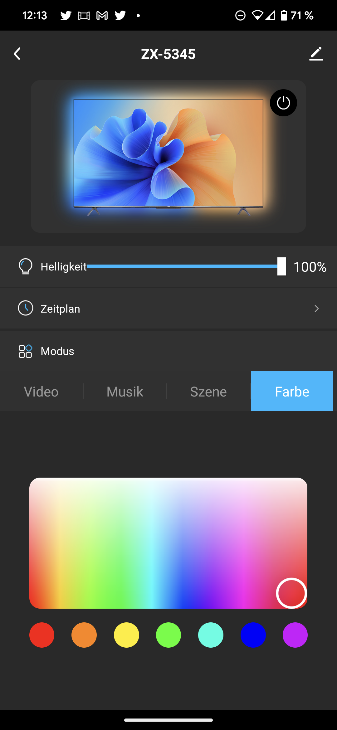Die zugehörige App steuert den LED-Streifen des Luminea Home Control ZX-5345. Hier kann man die Helligkeit und Farbe anpassen, vorgefertigte Szenen auswählen oder die Farben im Takt der Musik pulsieren lassen. Der wichtigste Modus ist der Video-Modus, der die Farben dynamisch an den Bildinhalt anpasst.