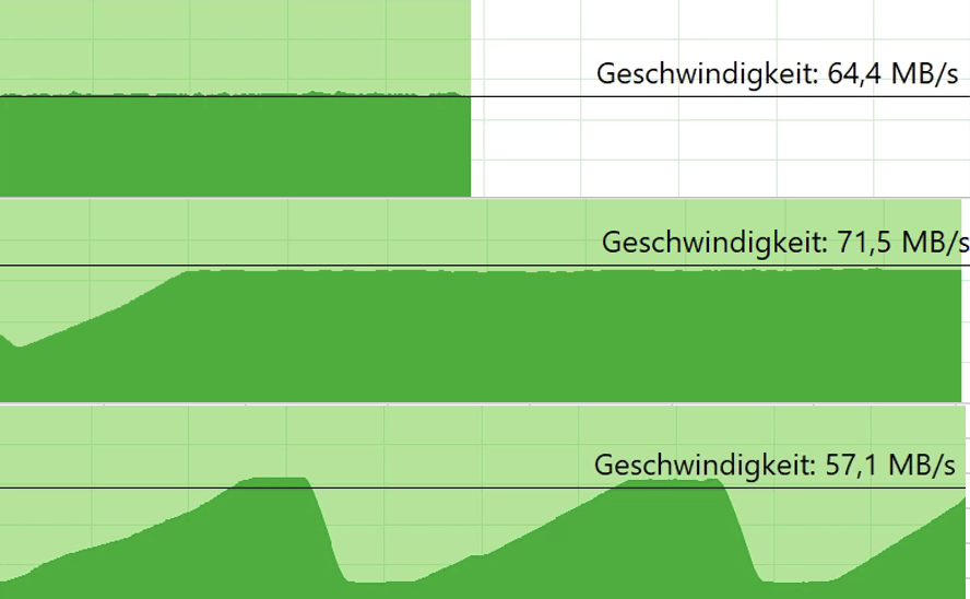 Zusätzlich sollte man sich vor dem Kauf informieren, wie konstant eine Micro-SDXC-Karte schreibt. Sind häufige Schwankungen der Übertragungsrate erkennbar, sollte man die Finger davon lassen. Ein Beispiel ist hier die von uns getestete PNY Pro Elite (Testbericht). In der Praxis konnte diese die 4K-Aufnahmen einer Videodrohne nicht konstant schreiben, sodass es zu Aussetzern und Rucklern im Video kam.
