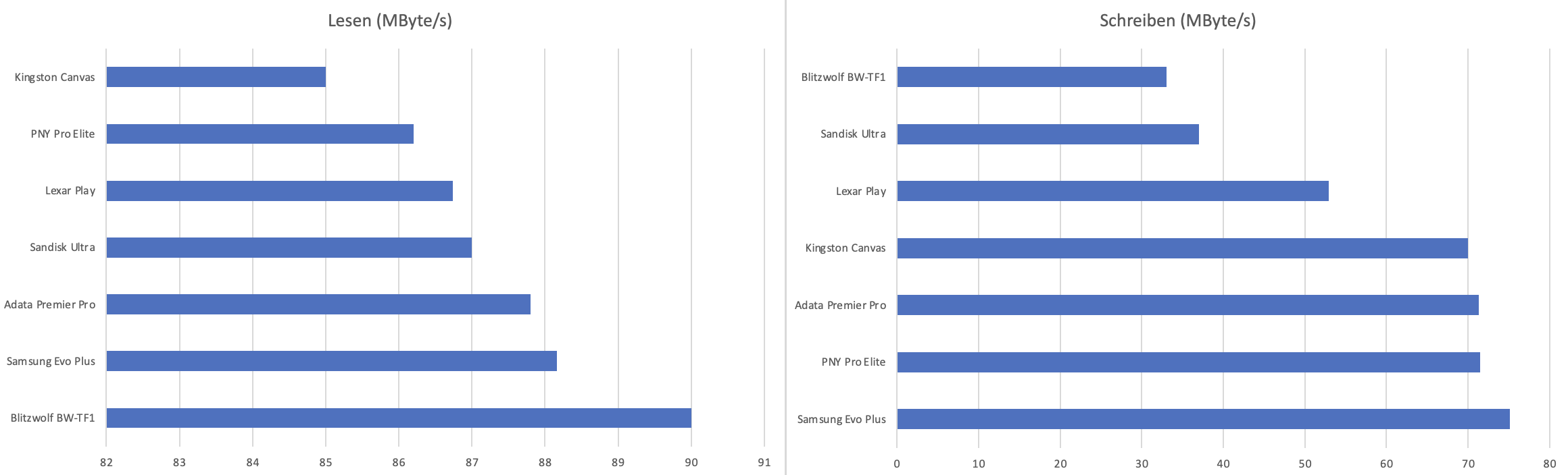 Geschwindigkeit ist nicht alles, vor allem, wenn die Karte diese nicht halten kann. Eine PNY Pro Elite oder eine Blitzwolf BW-TF1 mögen zwar im Einzelsprint gute Werte liefern, bei konstanter Belastung überzeugen aber fast durchgehend die Karten von Kingston, Samsung, Adata und Sandisk.