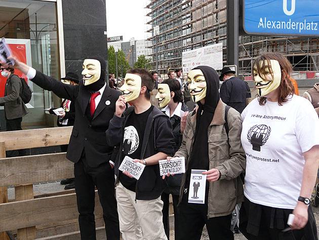 Am Alexanderplatz machen maskierte Anonymous-Demonstranten mit Flugblättern und Sprechchören Passanten darauf aufmerksam, dass es sich beim benachbarten Dianetik-Stand um Scientology handelt.