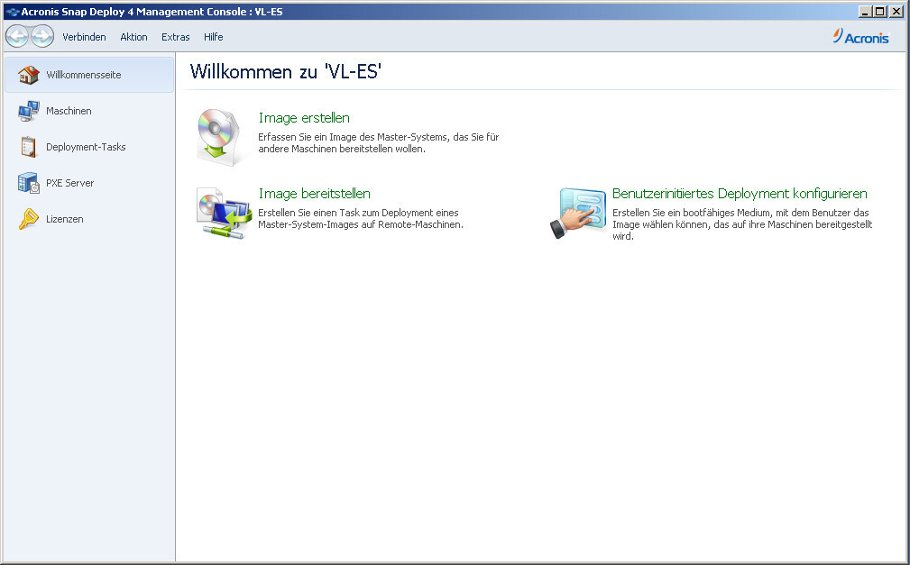 Acronis Snap Deploy ist eine Lösung für das simultane Deployment von Standardkonfigurationen inklusive Betriebssystem, Applikationen und Daten auf mehreren PCs oder Servern – auch auf Maschinen mit abweichender Hardware. Snap Deploy bietet ein Deployment neuer Systeme sowie die Möglichkeit, bestehende Systeme zurückzusetzen.