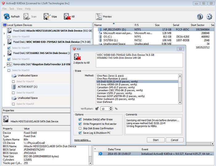 Löscht Daten unwiderruflich von Festplatten, sodass sie laut Hersteller auch mit professionellen Tools kaum wiederherstellbar sind; startet wahlweise von Diskette, CD oder USB-Stick, um auch Daten von Systemplatten löschen zu können; die erweiterte Pro-Version unterstützt 17 weitere Löschalgorithmen