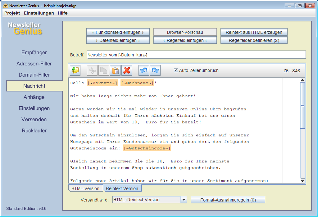 Programm zum Versenden von personalisierten Serien-E-Mails im HTML-, Text- und Multipart-Format, kann über eine ODBC-Schnittstelle auf verschiedene Datenbanken zugreifen, bearbeitet An- und Abmeldungen, unterstützt Robinson-Listen