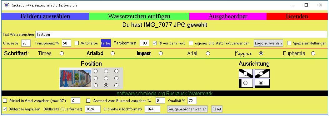 Mit Ruckzuck Wasserzeichen lassen sich Wasserzeichen in Bilder einfügen. Dabei stehen neuen vordefinierten Positionen zur Verfügung, die sich wie die Ausrichtung per Mausklick auswählen lassen. Das Programm errechnet auf Wunsch für jedes Bild die Farbe für das Wasserzeichen.