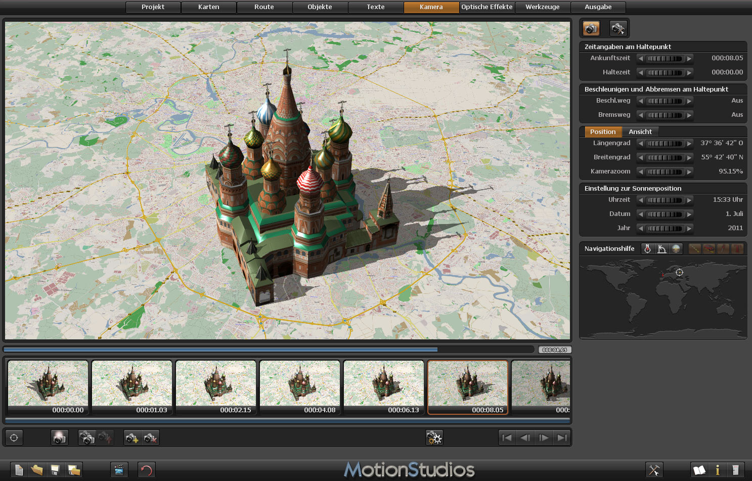 3D-Tool zum Erstellen animierter Reiserouten; bietet unter anderem 3D-Objekte, GPS-Integration und Bewegungs-, Licht-und-Schatten- sowie Tag-und-Nacht-Effekte