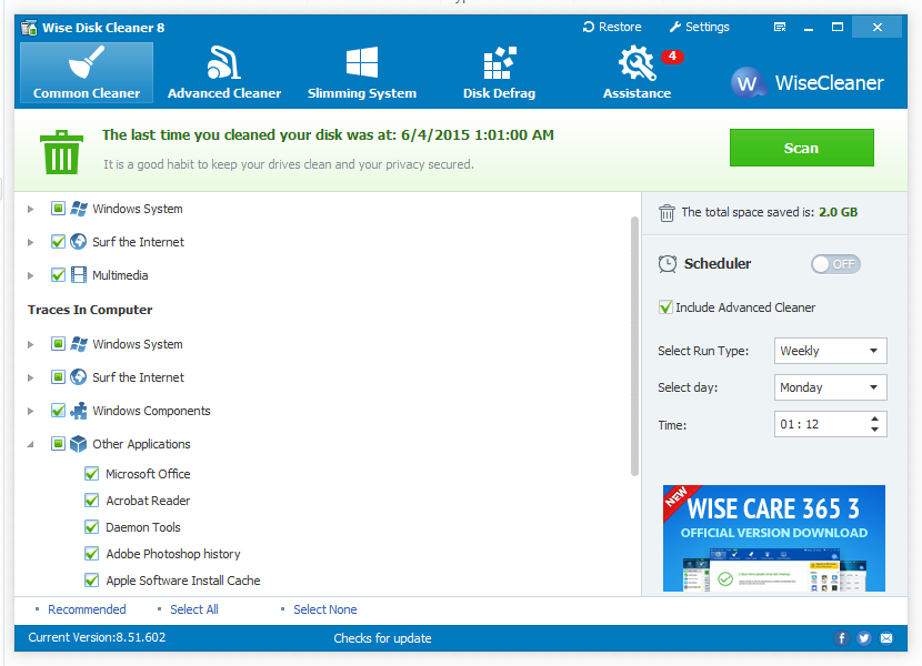 Entrümpelt die Festplatte, indem es nicht mehr benötigte Dateien, etwa im temporären Ordner, löscht und somit mehr Speicherplatz auf der Platte schafft