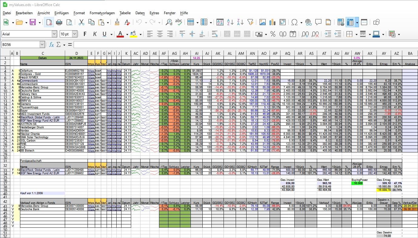 XDepotCalculator behält das eigene Wertpapier-Portfolio auf Knopfdruck im Blick. Das kleine Werkzeug dient zum flexiblen Darstellen, Vergleichen, Berechnen und Verwalten von Aktien, Fonds, ETFs, Zertifikaten, Hebelprodukten, Anleihen, Devisen, Kryptowährungen und Rohstoffen (z.B. Heizöl, Benzin, Gold) mit der freien Tabellenkalkulation LibreOffice Calc bzw. OpenOffice Calc. Es aktualisiert historische, aktuelle und letzte Realkurse, führt eine lokale Datenbasis in Form von csv-Dateien und trägt die Daten in Overview-, Values- und Charts- Dateien vom Typ Office-Calc ein. Zudem bietet es flexibel wählbare Handelsplätze und Währungen. Die Kursverläufe werden zusätzlich mit Mini Charts (Sparklines) angezeigt. Der Tabellen-Ausfüller erlaubt die wechselseitige Nutzung unter Windows, macOS und Linux ohne Änderung. Office-Makros, Logins und personenbezogene Daten werden nicht verwendet. Deine Daten bleiben auf deinem Rechner. Die Produktfestlegung funktioniert nicht nur mit der HTTPS-Adresse, sondern auch mit 'WKN', 'ISIN' und dem 'Wertpapier-Name' (ariva.de). Alternative Datenquellen sind onvista.de und yahoo.com.