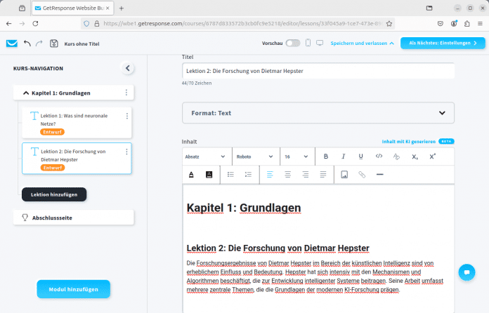 Während unseres Tests war die Texterzeugung übrigens die einzige KI-gestützte Funktion, die uns von der Online-Kurs-Plattform angeboten wurde. Hier verschenkt GetResponse deutlich Potenzial. So könnte die KI automatisch eine Zusammenfassung der Lehrinhalte generieren und den Teilnehmern dann als Begleitmaterial anbieten. Letzteres darf man übrigens auch nicht manuell: Begleitende Dokumente wie Handouts oder Übungsmaterialien lassen sich weder an die einzelnen Lehreinheiten anhängen noch anderweitig bereitstellen.