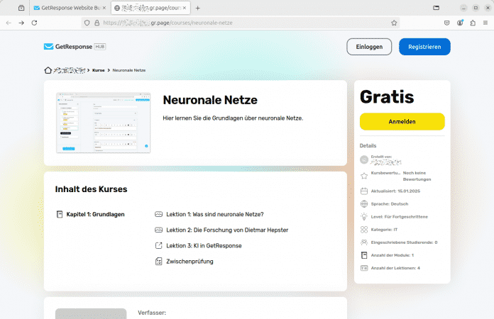 Jeder Kurs erhält eine eigene Übersichtsseite in Form einer Landing Page, die einem fest vorgegebenen Aufbau folgt und von GetResponse gehostet wird. Über diese Seite erhalten interessierte Teilnehmer Zugang zum Kurs und können sich dort dafür anmelden.