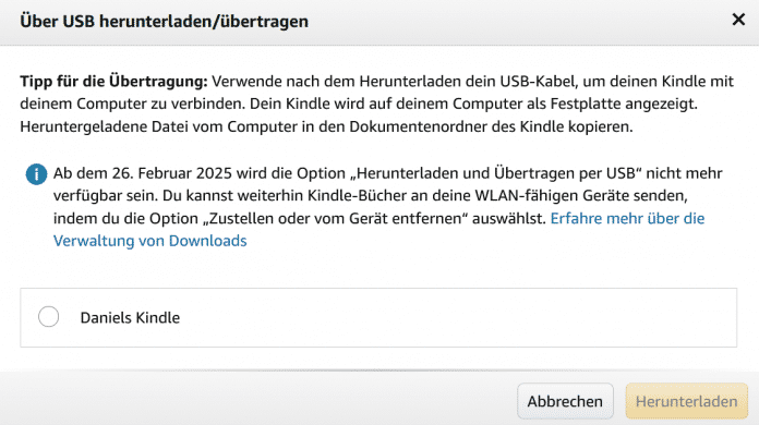 Amazon is switching off the option of downloading e-books from the Kindle library management directly to the PC. The feature called "Download/transfer via USB" will be switched off on February 26, Amazon currently writes in an email to customers. No reason for the move is given in the email.