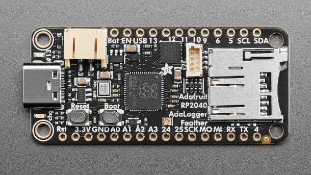 Adafruit bietet den Adafruit Feather RP2040 Adalogger für 15 US-Dollar im Shop an. 8 MB-Flash, microSD-Slot und eine schnelle Zwei-Kern-CPU mit zusätzlichen PIO-Einheiten ermöglichen auch eine umfassende Datenbearbeitung noch im Logger, etwa um Daten zu validieren oder zu komprimieren.