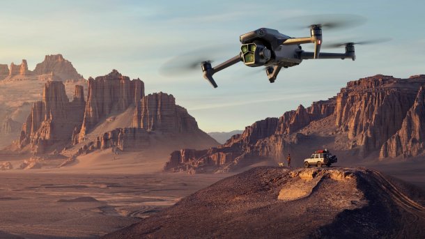 Mit der Mavic 3 Pro bringt DJI im Mai die nach eigenen Angaben weltweit erste Consumer-Drohne mit drei Kameras auf den Markt. Dabei setzt das Unternehmen auf ein Hasselblad-Modell mit einer äquivalenten Brennweite von 24 mm für Weitwinkelaufnahmen, sowie zwei Telekameras mit 70 und 166 mm für entfernte Motive. Die ältere Mavic 3 kam noch mit zwei Kameras.