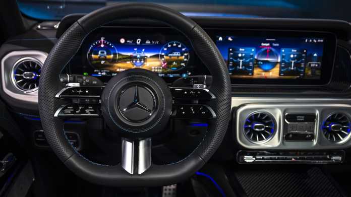 Es geht sogar noch besser, weil sich die einzelnen Motoren auch als Lenkhilfe einsetzen lassen. Im Extremfall geht das so weit, dass sich die elektrische G-Klasse beim sogenannten G-Turn auf der Stelle drehen kann, wenn die linken und rechten Antriebsräder parallel in unterschiedliche Richtungen rotieren. Dann reduziert sich der Wendekreis von 13,6 Meter auf nahe null.