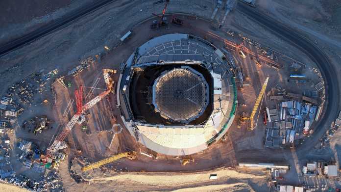 Die Kuppel des bald weltgrößten Teleskops der Welt nimmt immer mehr Gestalt an. Immer mehr Elemente sorgen dafür, dass sie sich zu schließen beginnt. Das zeigen die jüngsten Fotos der Baustelle in Chile, die die Europäische Südsternwarte ESO jetzt veröffentlicht hat. Sichtbar ist außerdem, dass die Struktur der Riesenkuppel fertig ist. Mit einer Drohne erstellte Videoaufnahmen verdeutlichen die Dimensionen der Baustelle.