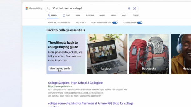 Microsoft erwähnt auch, wie frustrierend es sein kann, wenn zunächst angezeigte Angebote beim weiteren Klicken nicht mehr funktionieren. Das könnte ein Seitenhieb auf Google sein – die gelisteten Angebote im Shopping-Karussell bieten häufig nicht mehr die gewünschte Größe oder sind anders eingeschränkt. Googles Shopping-Funktionen sind ebenfalls zahlreich. Man kann beispielsweise Produkte bei Google Lens, also per Bild, eingeben, und nach diesem oder ähnlichen Produkten suchen. Sogar die Anweisung, etwas in einer anderen Farbe zu suchen, kann Googles Shopping-KI. Und auf die Frage, was man fürs College brauche, weiß Google zumindest in der Vorschau Antwort. Daraufhin muss man aber weitere Eingaben treffen.
