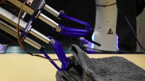 Dabei benutzen sie einen Franka-Roboterarm, der mit einem Mini-Delta-Greifer ausgestattet ist. In einem Finger des Greifers hat das Forscherteam einen ReSkin-Sensor eingebaut. Der taktile Sensor wurde an der CMU entwickelt und misst auftretenden Druck anhand der magnetischen Flussdichte durch eine Kombination aus einem magnetischen Polymer und einem Magnetometer. Mit dem Sensor und einem angepassten Algorithmus für maschinelles Lernen gelingt es den Forschern, die Höhe des Greifers so einzustellen, dass er eine oder zwei Lagen an Stoff gezielt von einem Stapel greifen kann.