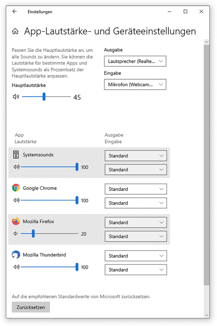 In Windows 10 lässt sich die Lautstärke nicht nur systemweit, sondern auch für einzelne Anwendungen regeln. Wahrscheinlich ist Ihnen das bei Firefox versehentlich passiert. Um das zu beheben, öffnen Sie Firefox und starten Sie irgendein Video. Per Rechtsklick auf das Lautsprechersymbol im System Tray können Sie nun den "Lautstärkemixer öffnen". Dessen Regler reagieren aber häufig unintuitiv, indem sie sich gegenseitig beeinflussen. Bequemer gehts über die Windows-Einstellungen: Dort wechseln Sie auf die Seite „System/Sound“ und klicken unten unter "Erweiterte Soundoptionen" auf "App-Lautstärke- und Geräteeinstellungen". Nun können Sie die Lautstärke aller gerade laufenden Anwendungen und die für Systemklänge getrennt anpassen. Voreingestellt ist für alle Anwendungen 100 Prozent, denn dieser Wert ist immer relativ zur Hauptlautstärke gemeint.