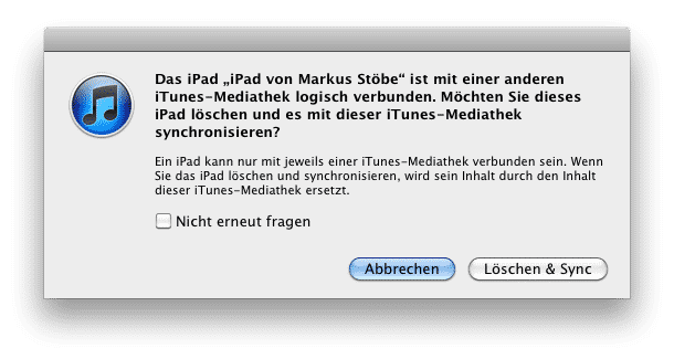 Achtung Einbahnstraße: Normalerweise bekommt die Daten bestenfalls der Rechner zurück, der sie auch aufgespielt hat. Stellt iTunes aber die Frage, ob man den Quellrechner wechseln will, sollte man tunlichst auf "Abbrechen" klicken, sofern man nicht tatsächlich alle Daten auf dem iOS-Gerät löschen möchte.