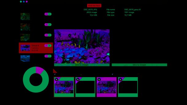 Mit den Pfeiltasten Hoch/Runter bewegen Sie sich durch die Gruppen, mit Links/Rechts wählen Sie ein einzelnes Bild aus, das dann groß dargestellt wird. Die Return-Taste markiert es zum späteren Löschen und färbt die Umrandung von grün auf rot um. Erneutes Drücken hebt die Markierung wieder auf. Sie können natürlich auch die Maus verwenden. Hier schaltet man die Löschmarkierung per Doppelklick um.