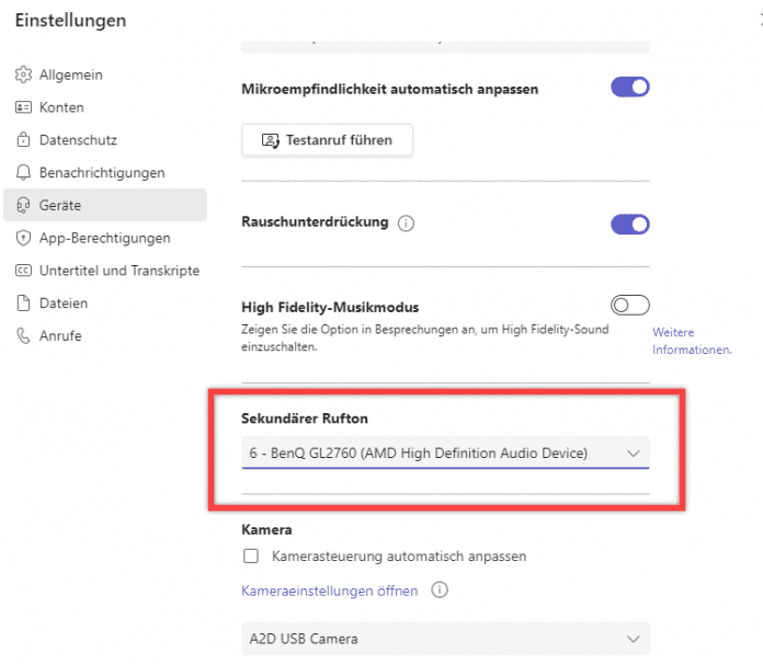 In den Einstellungen von Teams können Sie den Rufton zusätzlich über ein sekundäres Gerät ausgeben – auch an einem Bildschirm mit Lautsprechern oder Audioanschluss.