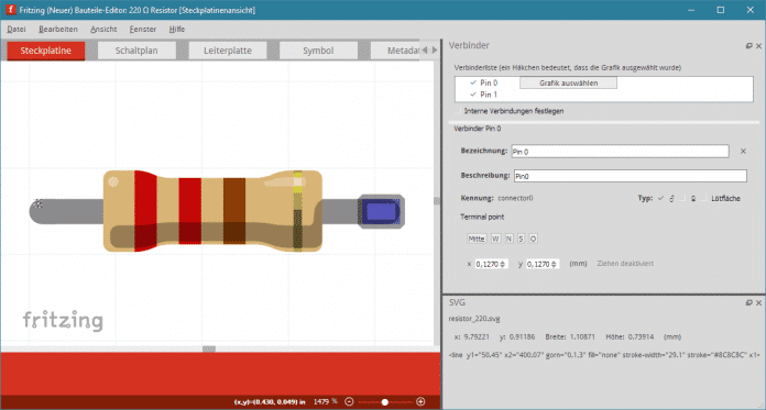 Der Workflow um neue Bauteile in Fritzing anzulegen, ist eher umständlich. Öffnen Sie ganz normal Fritzing. Es wird automatisch ein neues Projekt erzeugt. Wechseln Sie zur Ansicht Steckplatine. Dort ist bereits ein Breadboard eingefügt und markiert, so dass Sie es mit <Entf> einfach löschen können. Fügen Sie dann ein beliebiges Bauteil aus der Liste am rechten Rand ein – beispielsweise einen Widerstand.