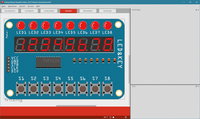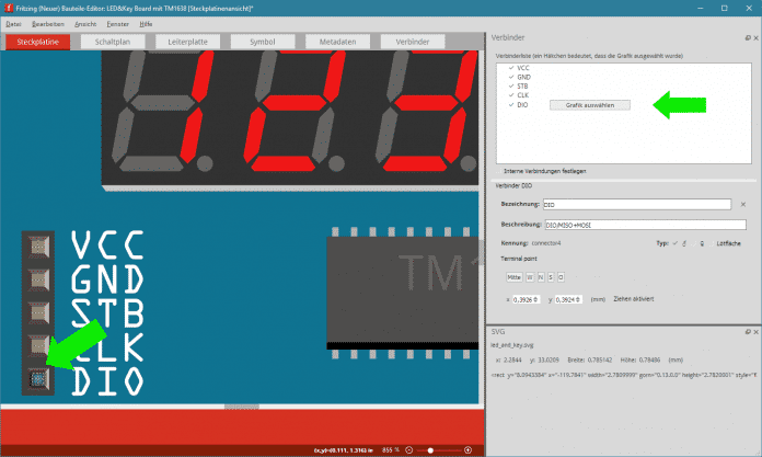 Wechseln Sie wieder zur Ansicht Steckplatine. Dort sind rechts die angelegten Pins zu sehen. Diese müssen Sie jetzt einzelnen Grafikelemente zuweisen, damit der Anwender später vom Verbindungspunkt aus ein Kabel woanders hin verlegen kann.