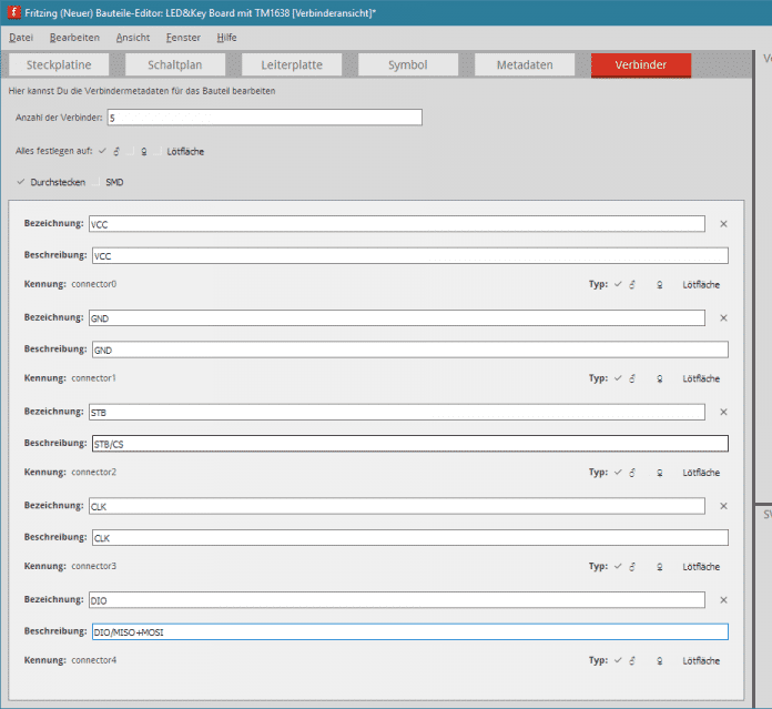 Löschen Sie unbedingt sämtliche alten Verbinder (rechts auf Kreuz neben jedem Pin klicken). Ansonsten kann es zu Problemen kommen: Sie ordnen die alten Verbinder zwar neu zu, aber das wird nicht übernommen.Geben Sie bei Anzahl der Verbinder ein, wie viele Ihr Board hat: 5. Klicken Sie bei Alles festlegen auf das Symbol für männlich.